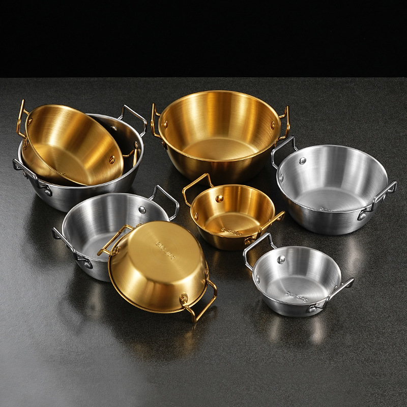 跨境不锈钢韩式米酒碗单柄双耳泡面锅带盖金色小吃碗沙拉碗暴力熊