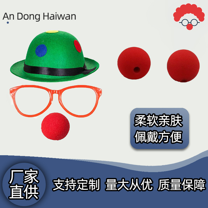 スポンジの醜い鼻の赤い鼻の道化師は道具のマジックを飾ってハロウィンの部品のメーカーを飾って踊ります。