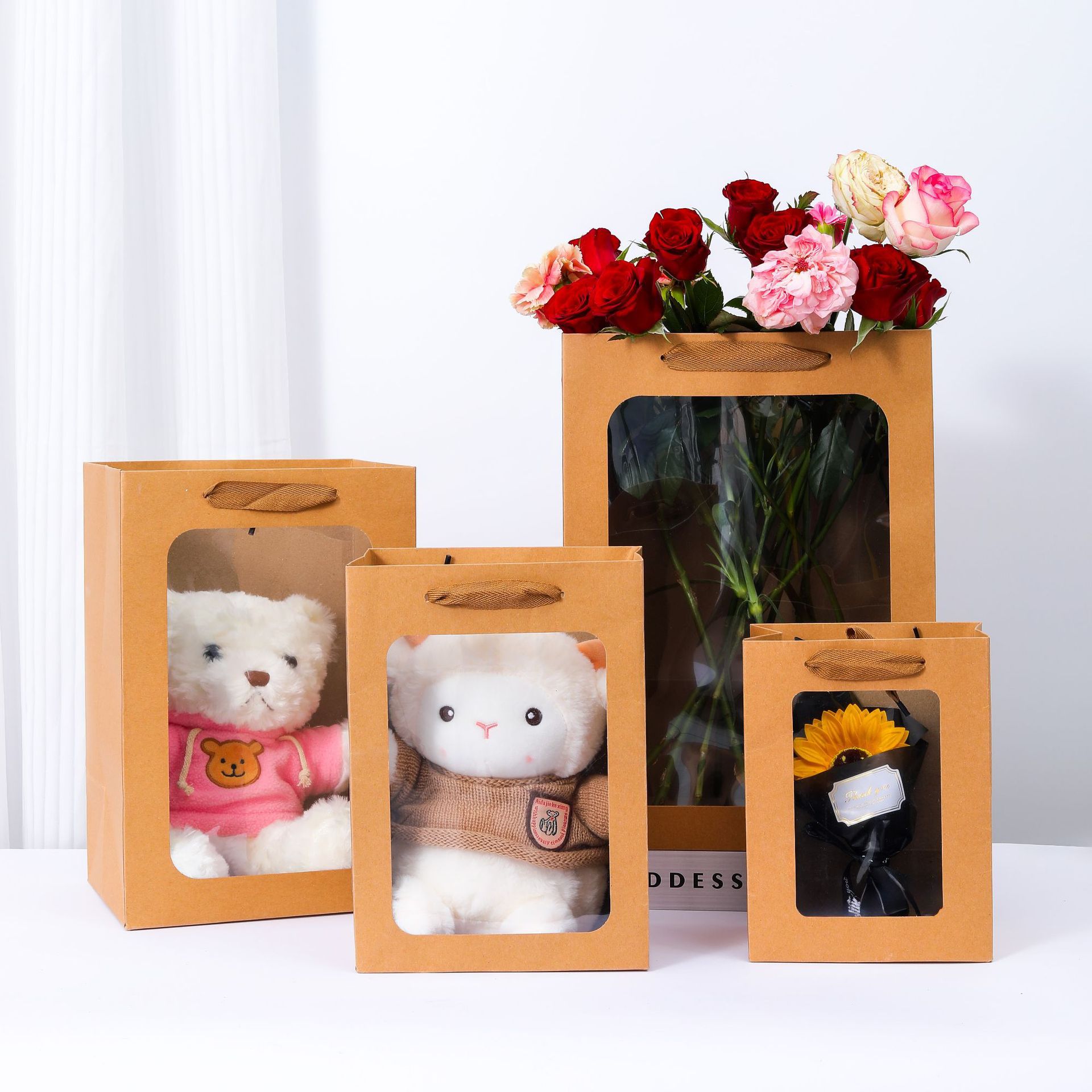 バレンタインデーウィンドウギフトバッグ特大既製人形フラワーペーパーバッグPVC透明ウィンドウハンドバッグ卸売