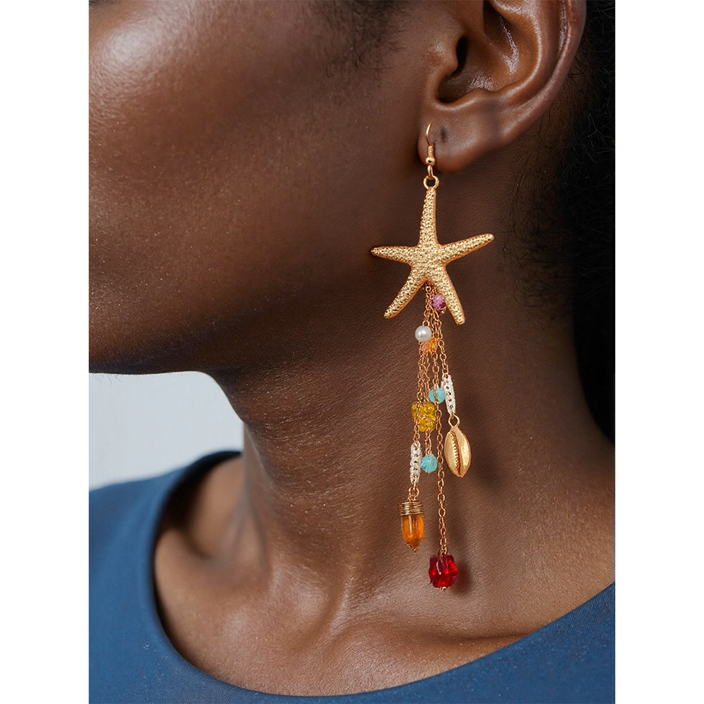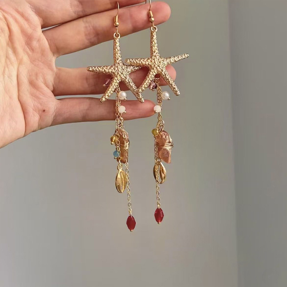ヨーロッパとアメリカのクロスボーダー海洋インスタイルメタルヒトデクラゲイヤリングボヘミアンイミテーションパールクリスタルタッセルイヤリング