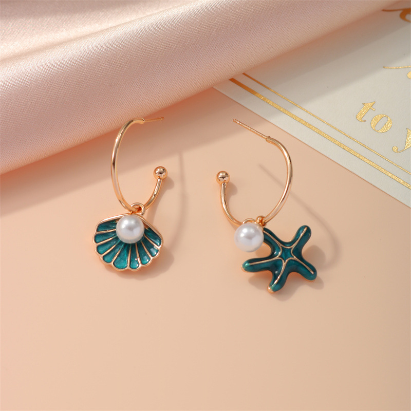 ヨーロッパとアメリカのクロスボーダー非対称オーシャンスタイルイヤリング、真珠貝、ヒトデイヤリング、オイルドロップイヤリング、ファッショナブルな女性用ジュエリー卸売