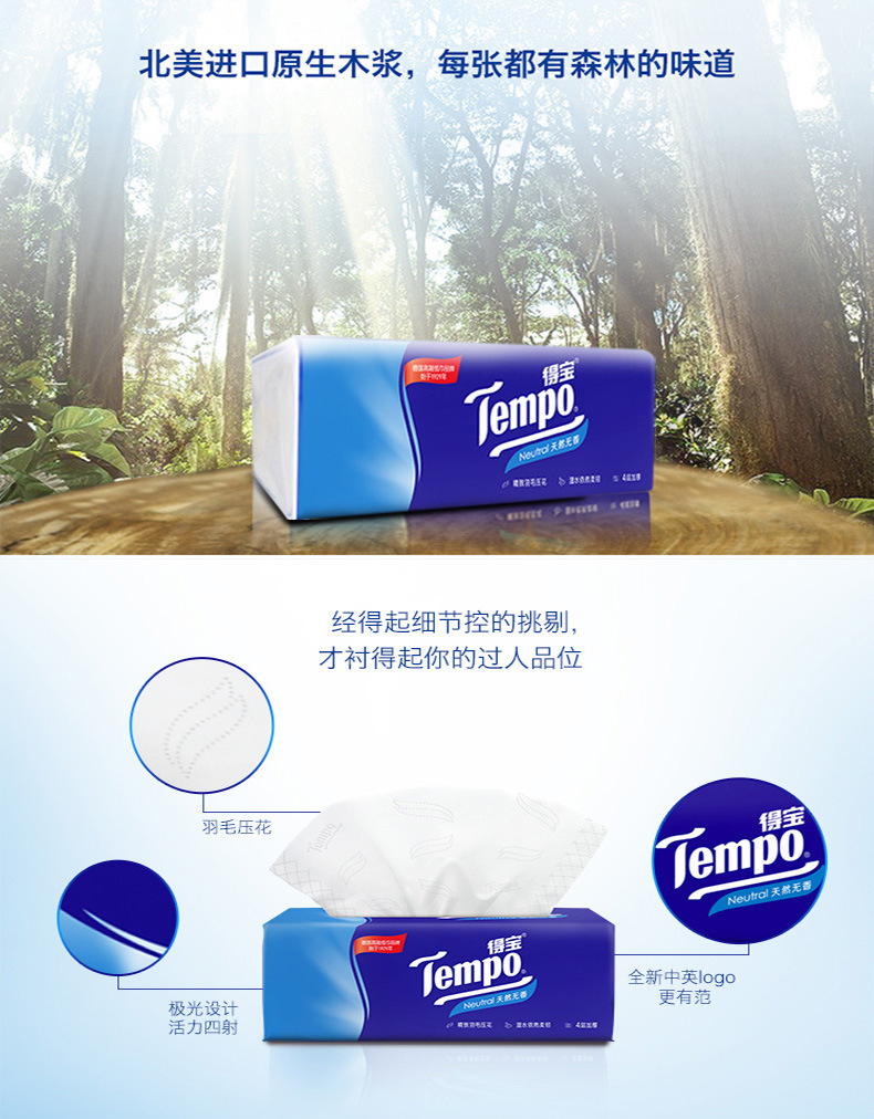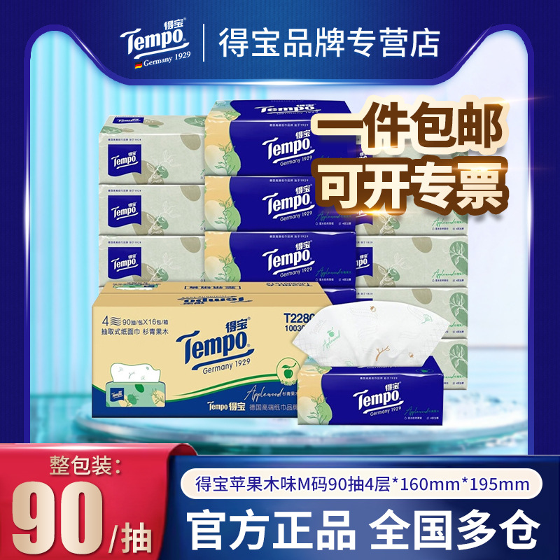Tempo得宝抽纸90抽四层加厚软抽纸巾抽取式苹果木味面巾纸批货
