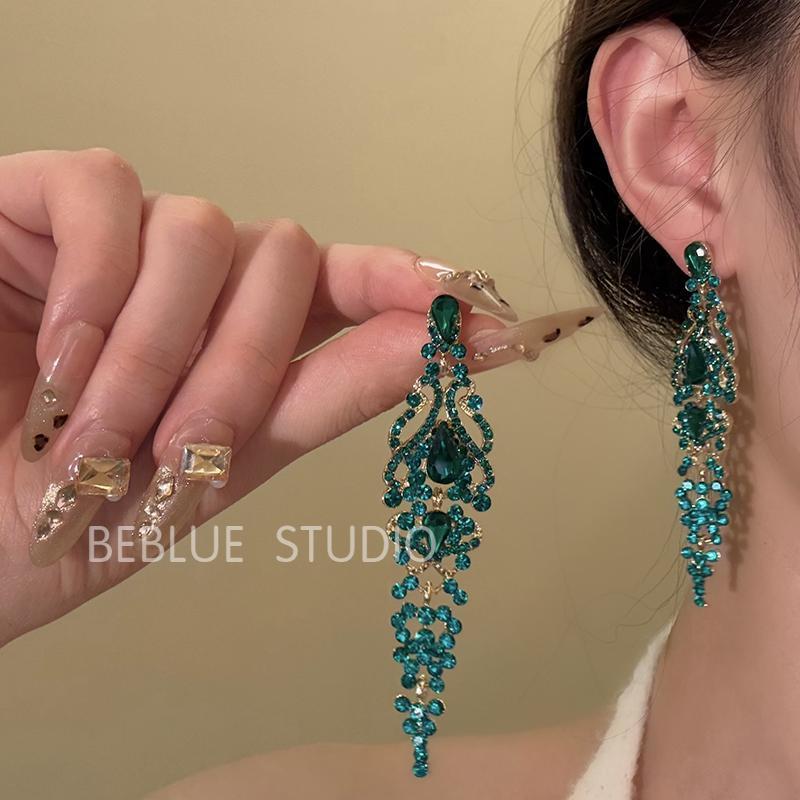 レトロなフランスの宮殿スタイルのイヤリング、グリーンジルコンタッセルイヤリング、ロングスタイルのファッショナブルなイヤリング、ノンホールピアス