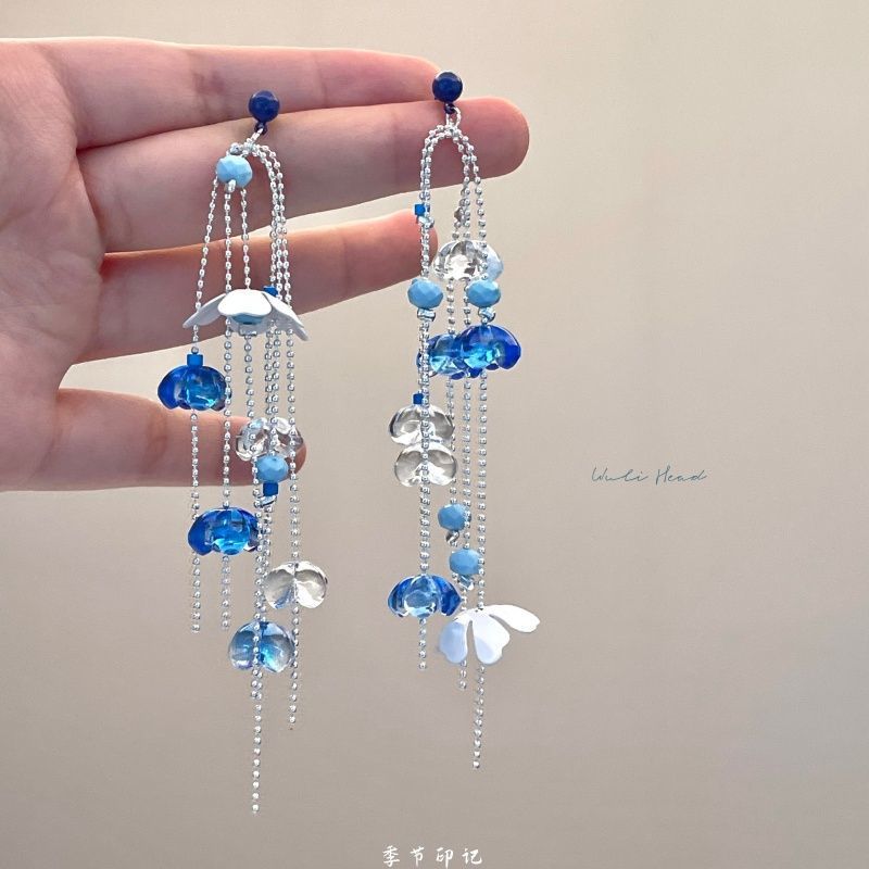 [ 无厘头 ] 浮游水母 超仙蓝色花朵流苏小众设计高级气质耳环耳夹