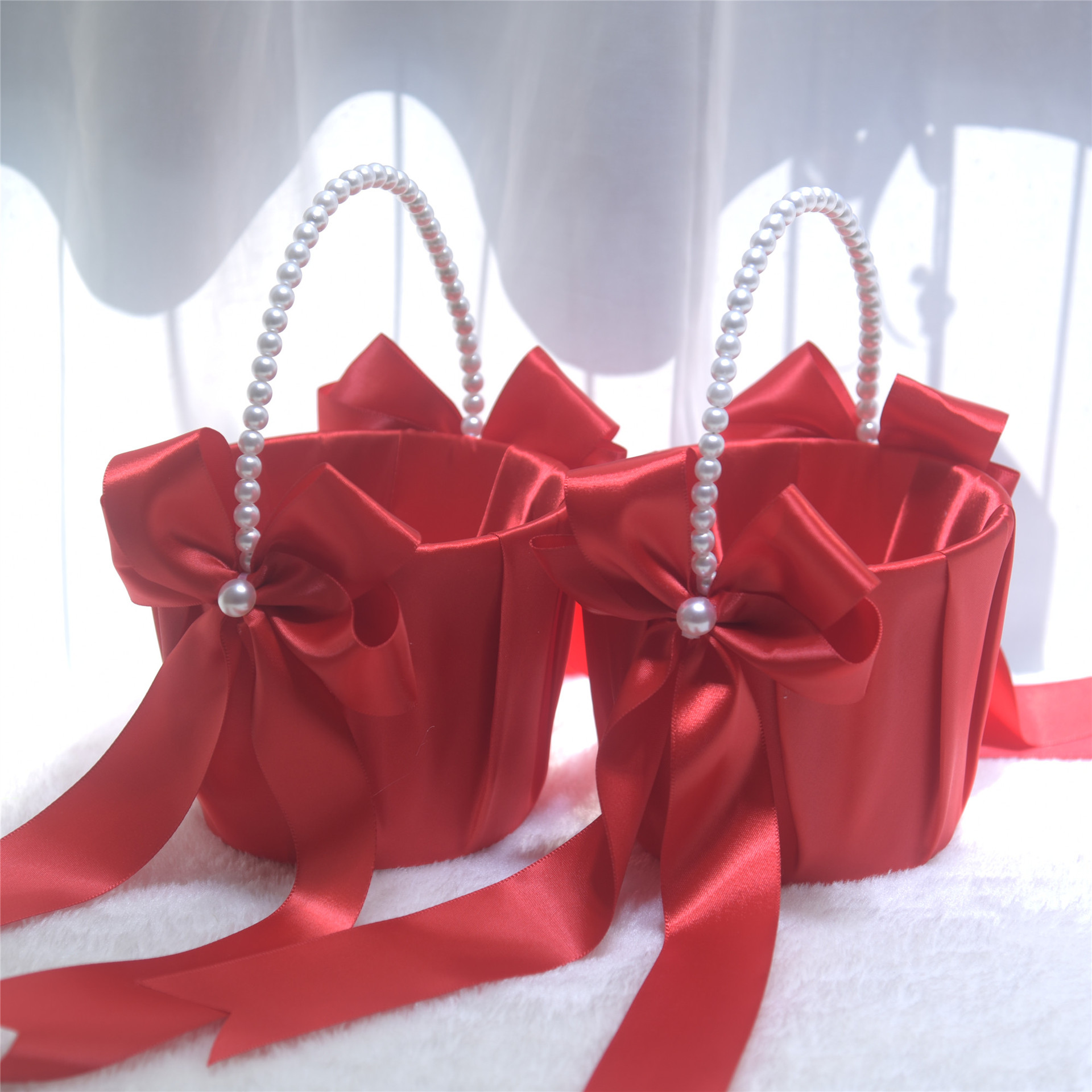 结婚花童撒花篮子婚礼手提小花篮放花瓣出嫁置物篮子红色缎带装饰