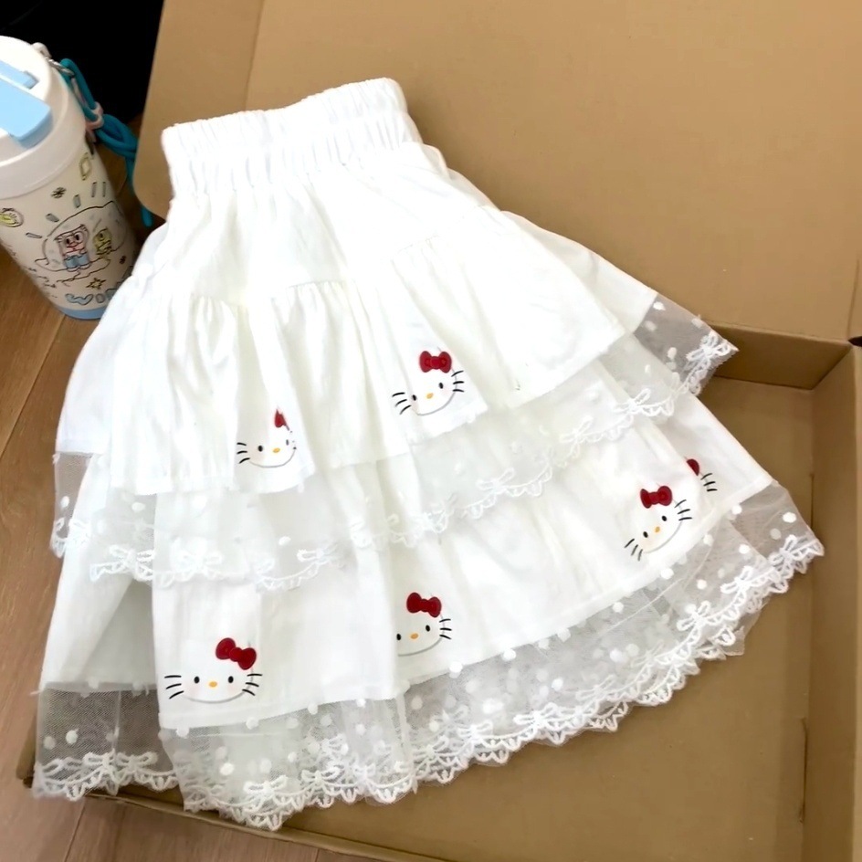 韓国の甘いキティ猫レーススプライシングケーキスカートレース新しい夏のハイウエストふわふわスカート