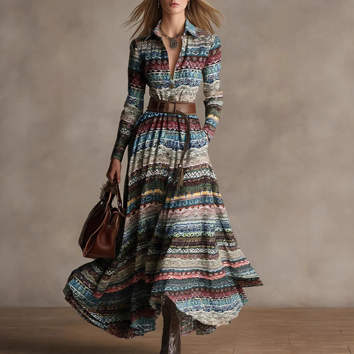 2025 ヨーロッパとアメリカのアマゾンの新しい長袖ドレスボヘミアンリゾートスタイルの大きな裾のプリントドレス