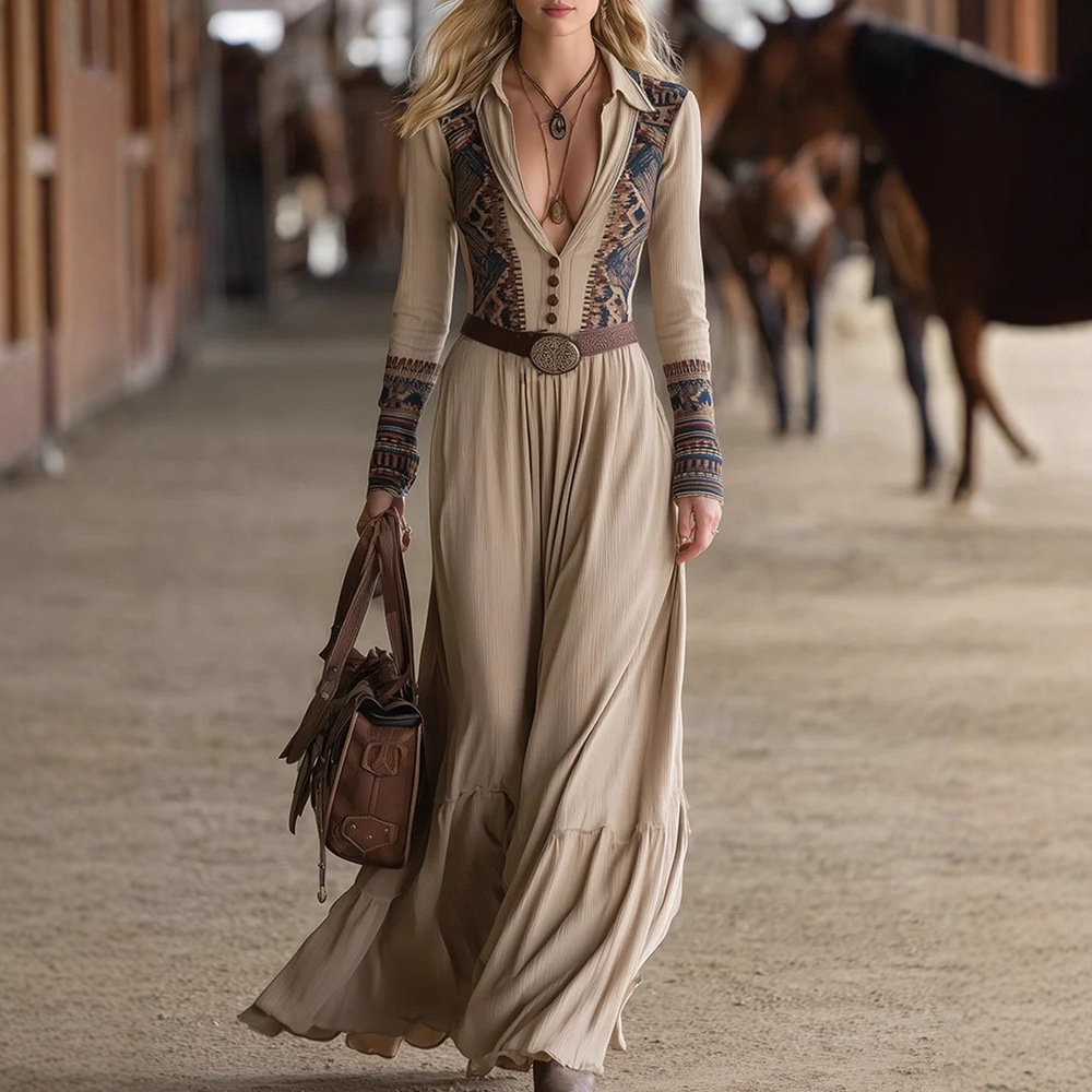 跨境独立站女装复古V领田园风印花长袖连衣裙欧美民族部落棉复古