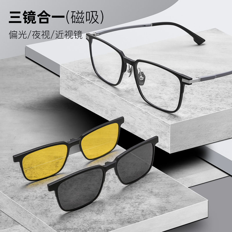 磁気スリーインワンサングラス、高精細偏光ドライビンググラス、ビジネスメンズβチタンメガネフレーム卸売