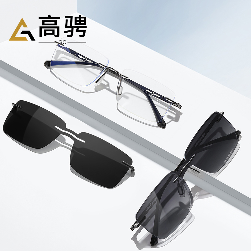 新品メンズフレームレスマグネット吸込鏡偏光紫外線防止サングラス付き度数近視眼鏡フレーム7202