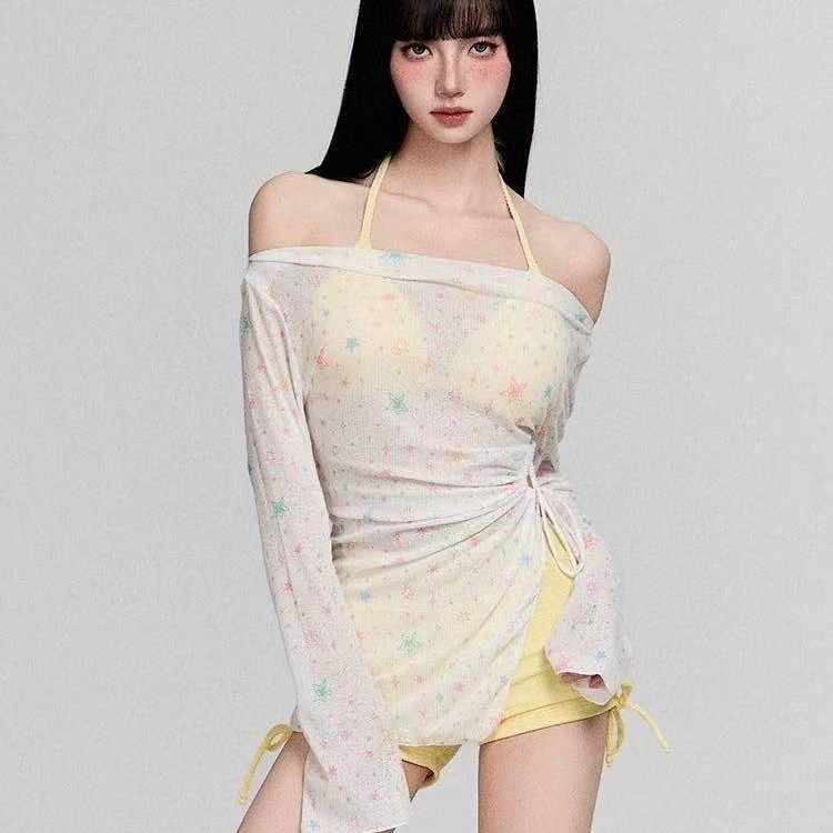 ビキニ水着 レディース スター 長袖 日焼け止め カバーアップ スプリットボクサー ボトムス お腹カバー 着痩せ コンサバ 温泉 3点セット