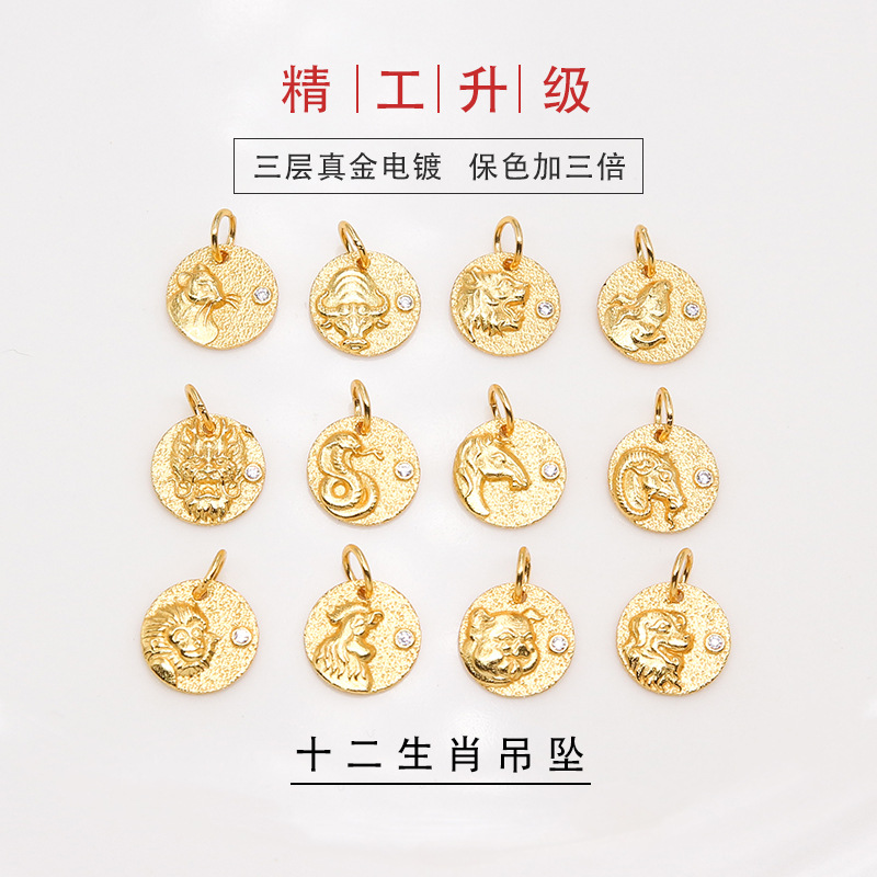 S925純銀真金保色キラキラ十二生肖円吊牌diyブレスレット手串部品本命年ペンダント