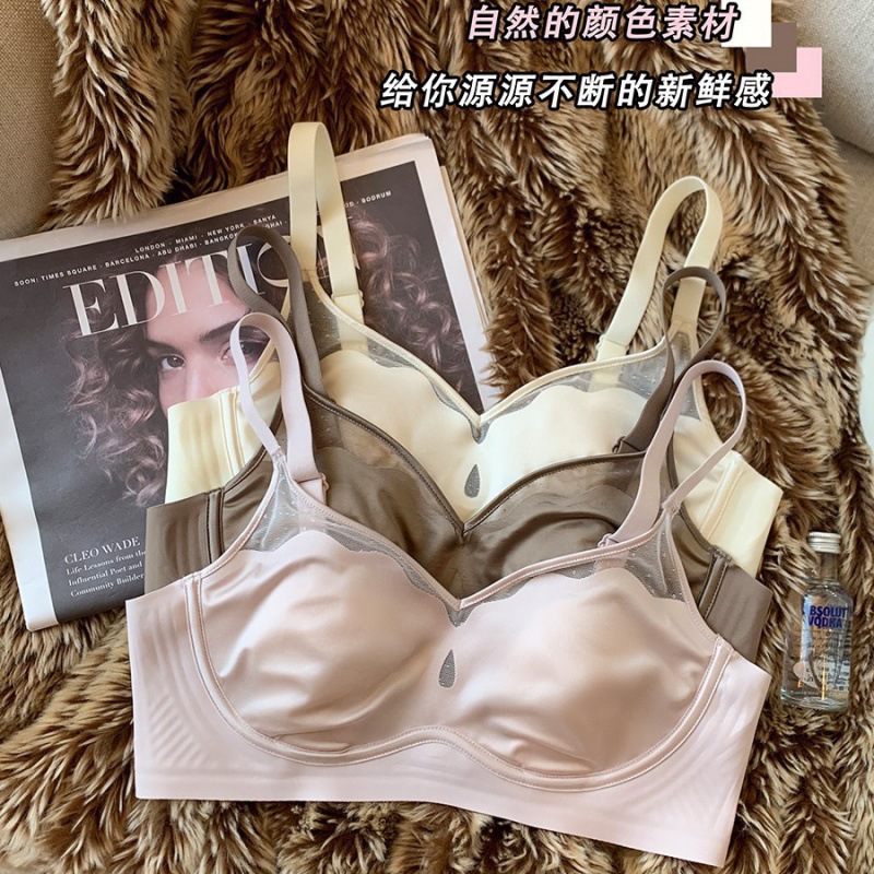 サテンフレンチ極薄大きい胸と小さい胸の下着、フェミニンなメッシュ薄いたるみ防止ノンワイヤーブラジャー