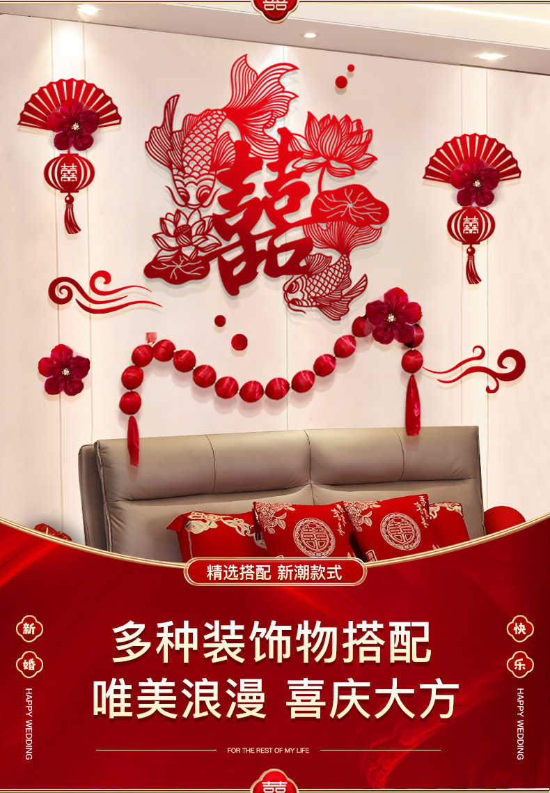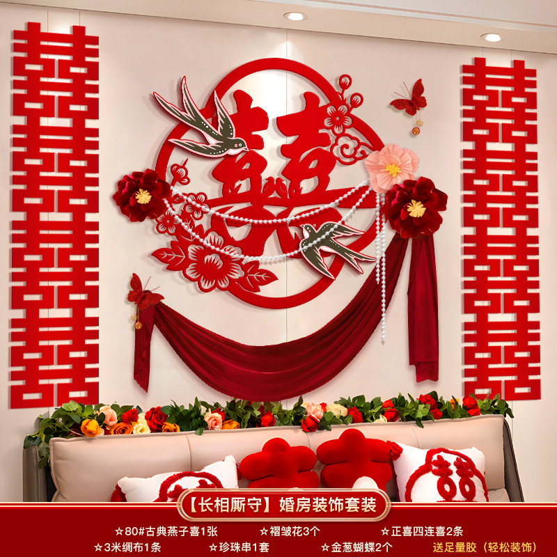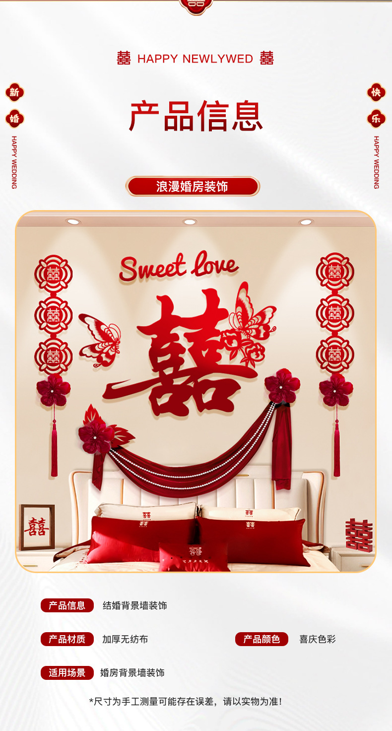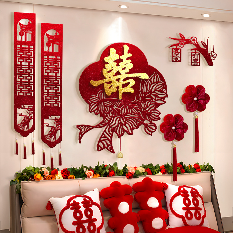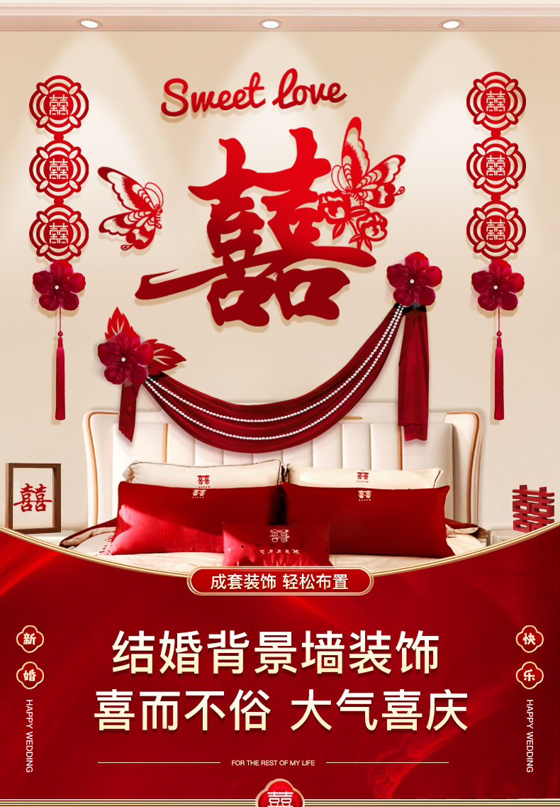 结婚布置新房男方女方卧室床头装饰婚房婚礼高级感喜字背景墙套装