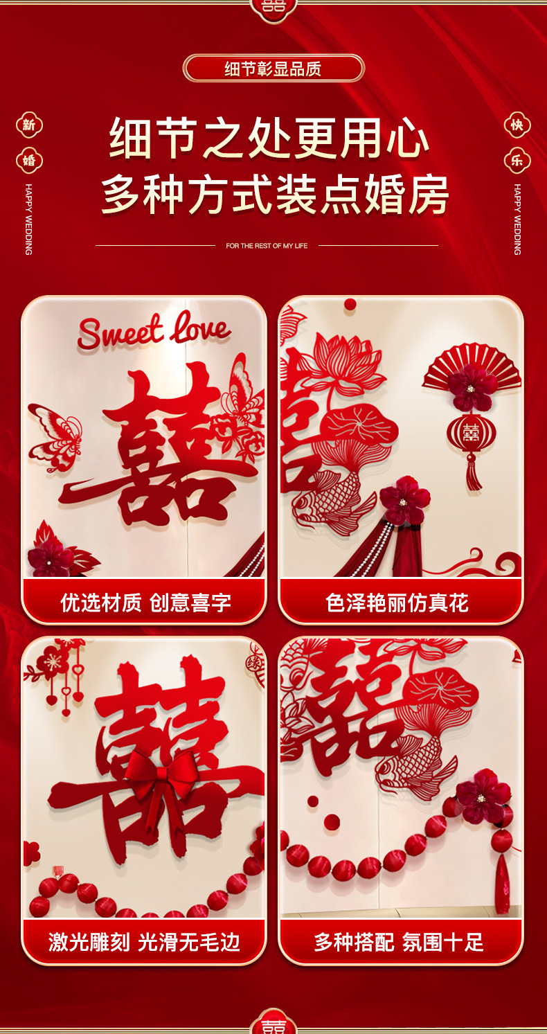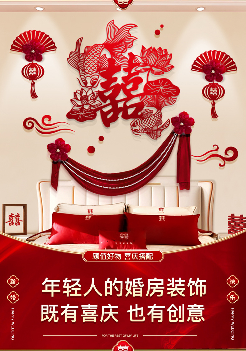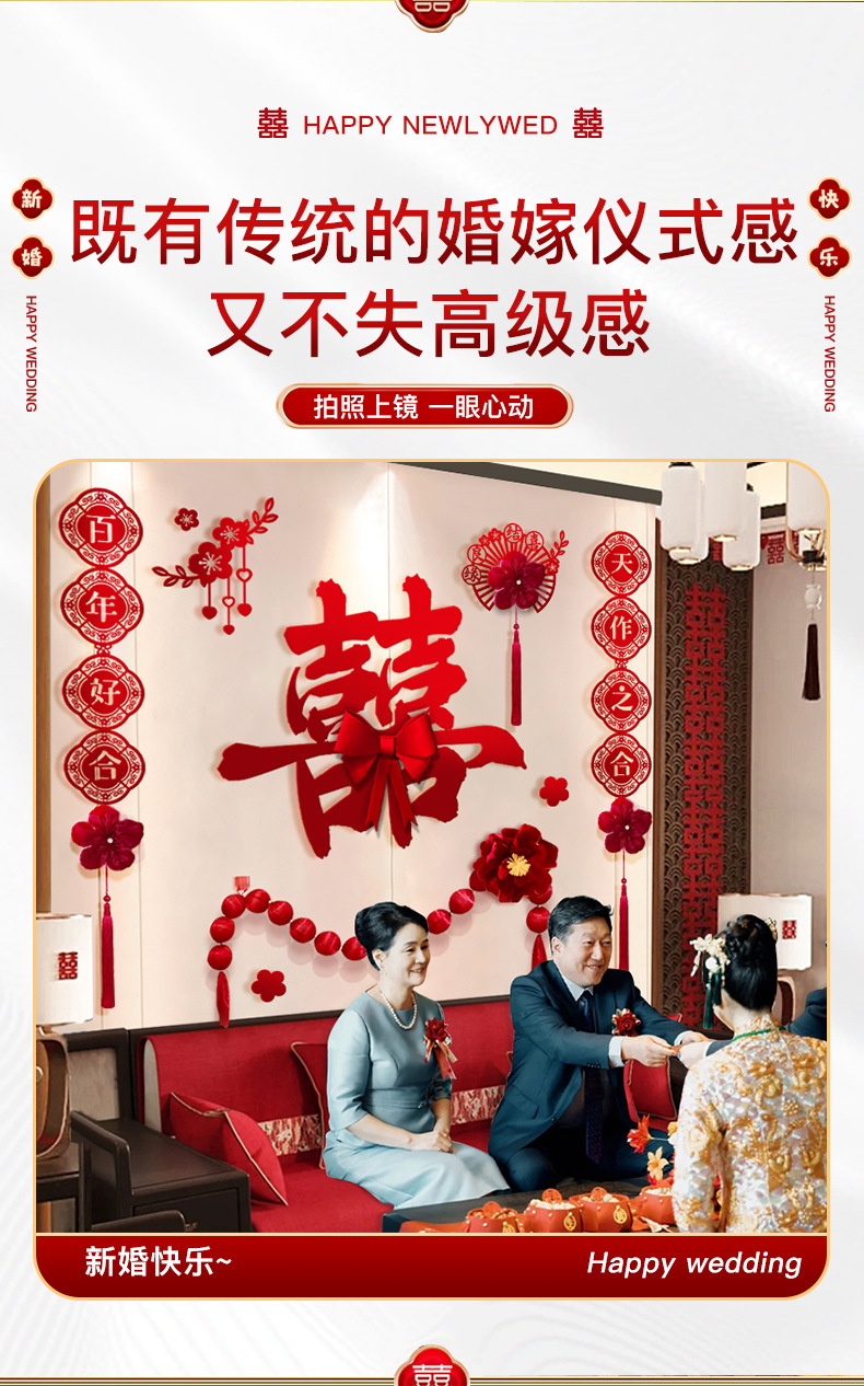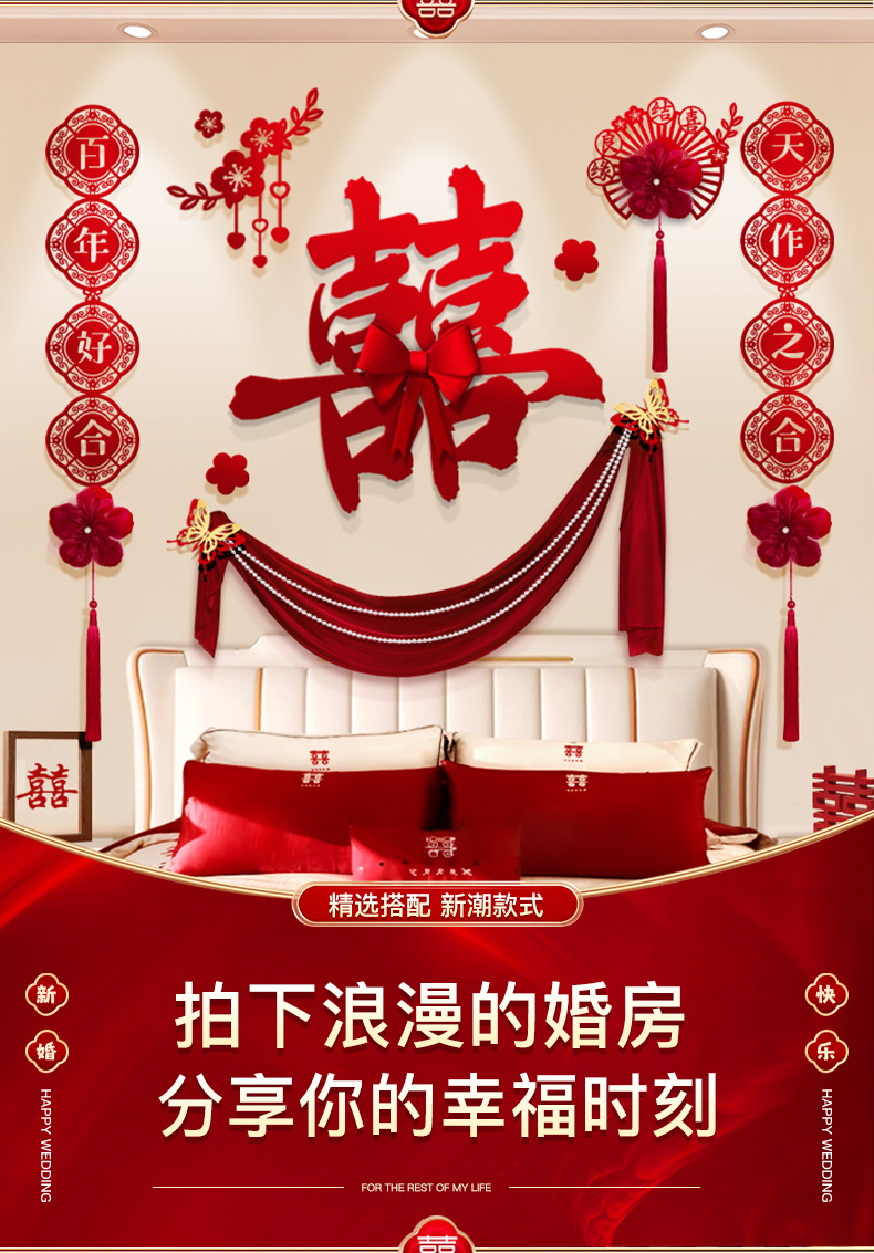 结婚布置新房男方女方卧室床头装饰婚房婚礼高级感喜字背景墙套装