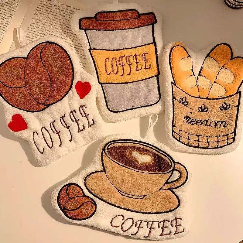 跨境新款咖啡擦手巾加厚珊瑚绒刺绣毛巾可爱擦手巾厨房卫生间毛巾