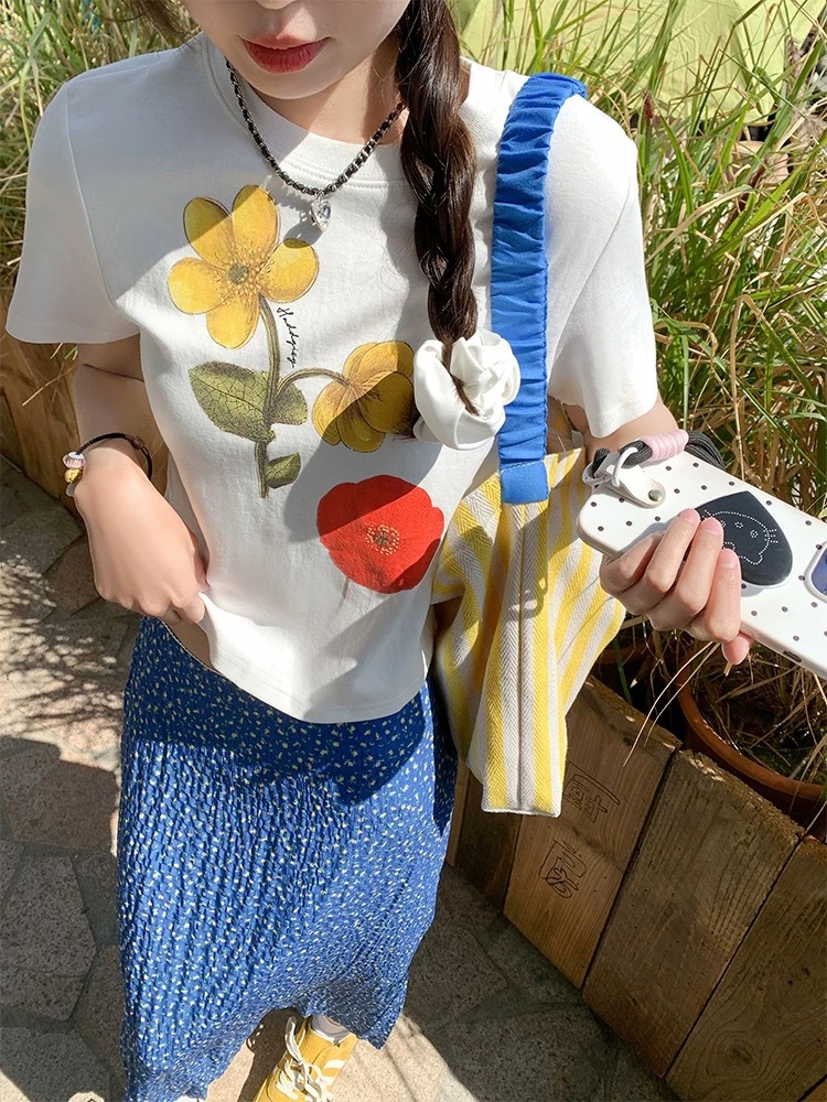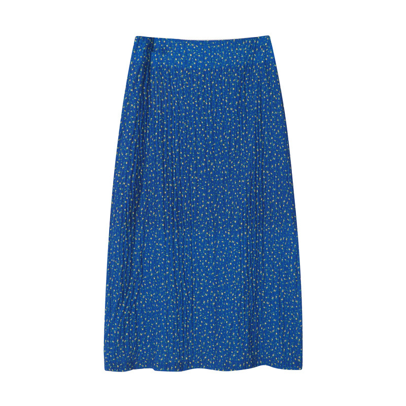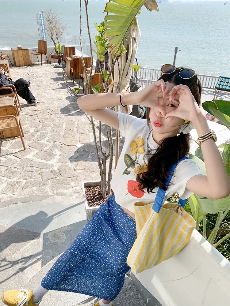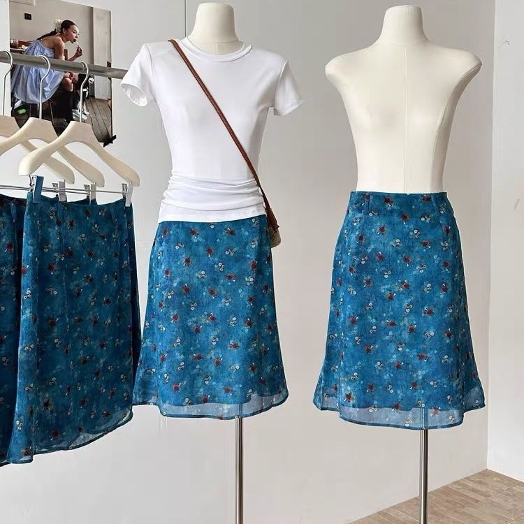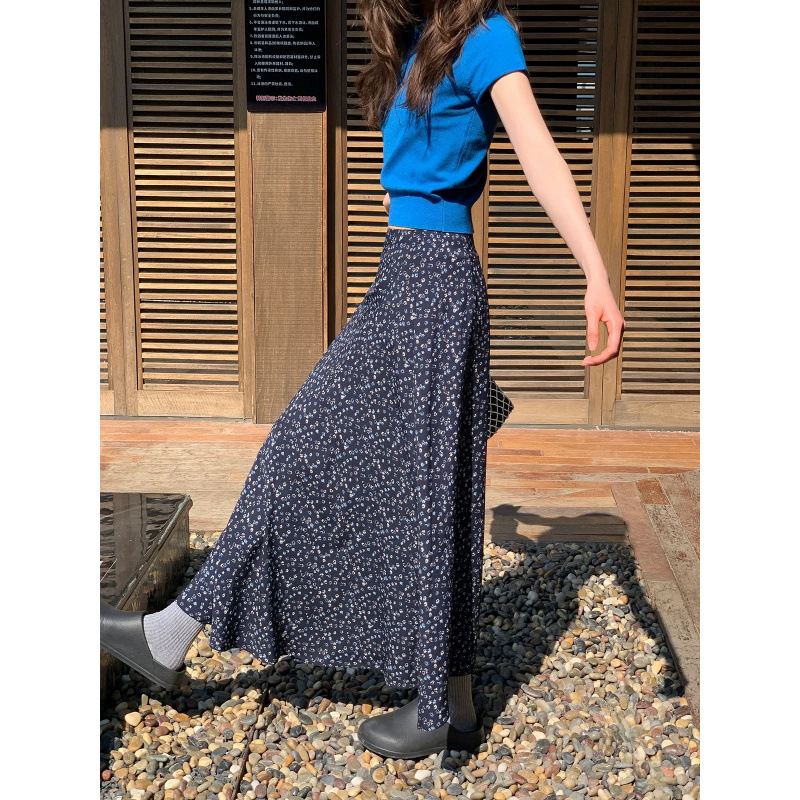 YC&レトロローウエストブルー花柄スカートホットガールヒップカバー花柄ミディスカート西洋風年齢軽減気質ショートスカート