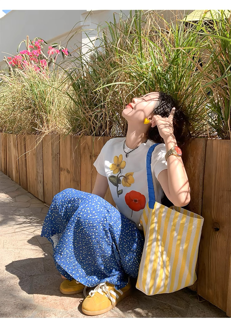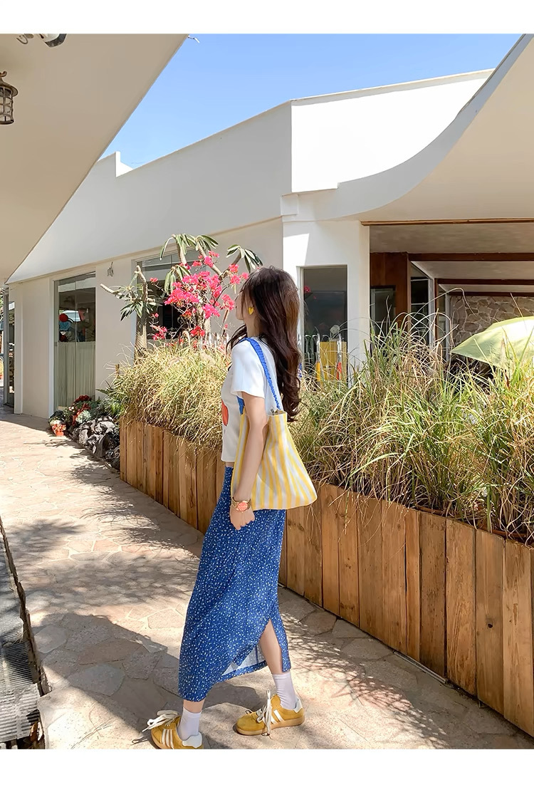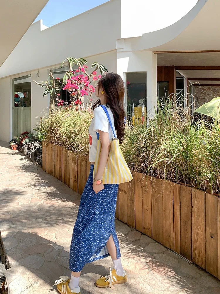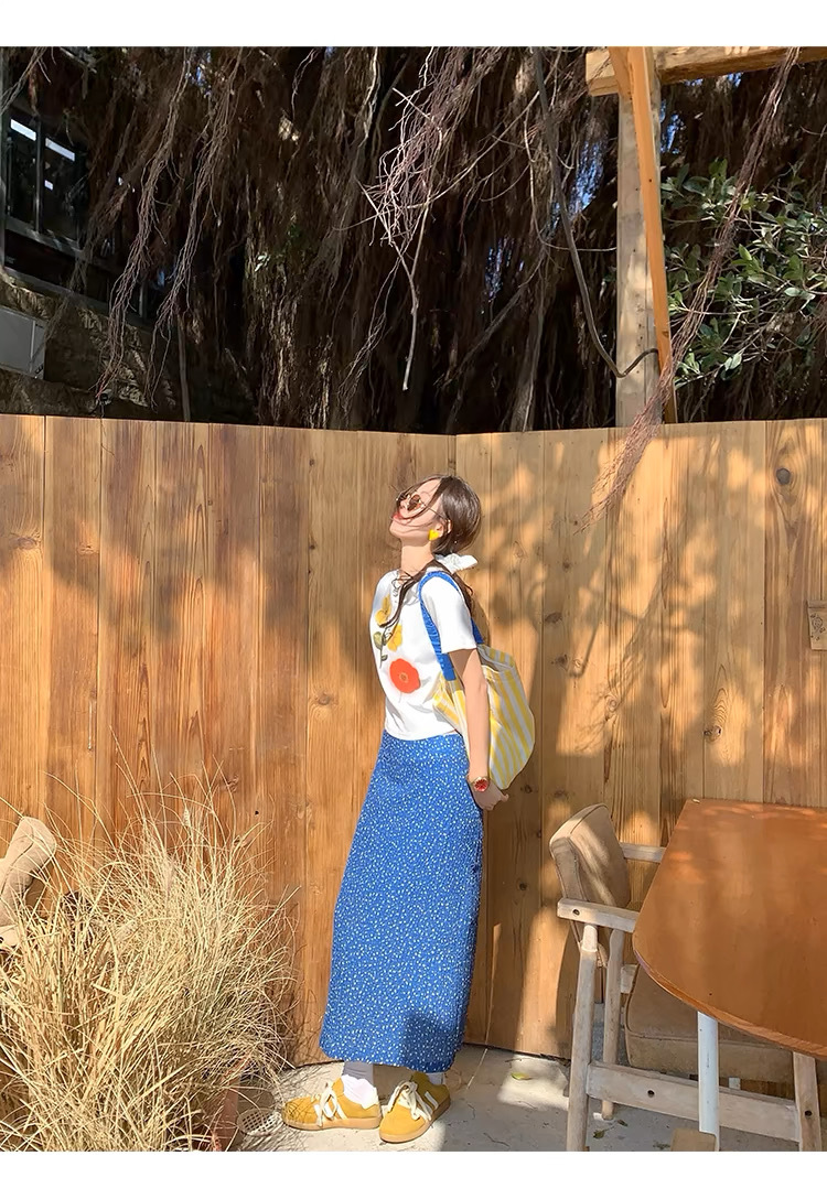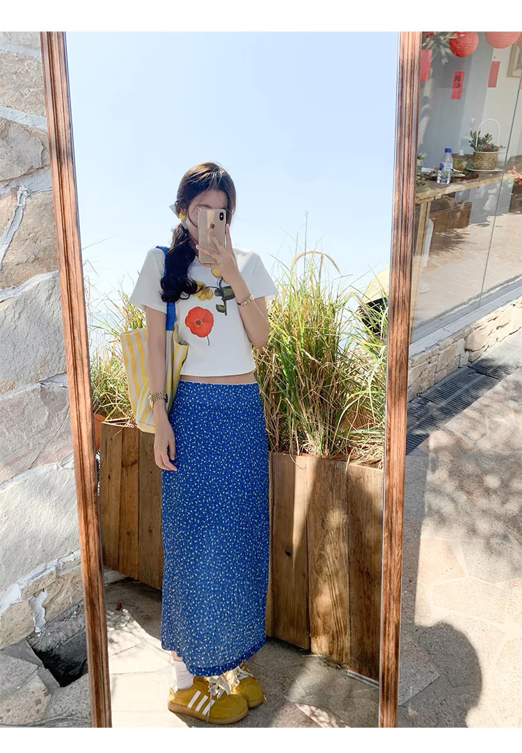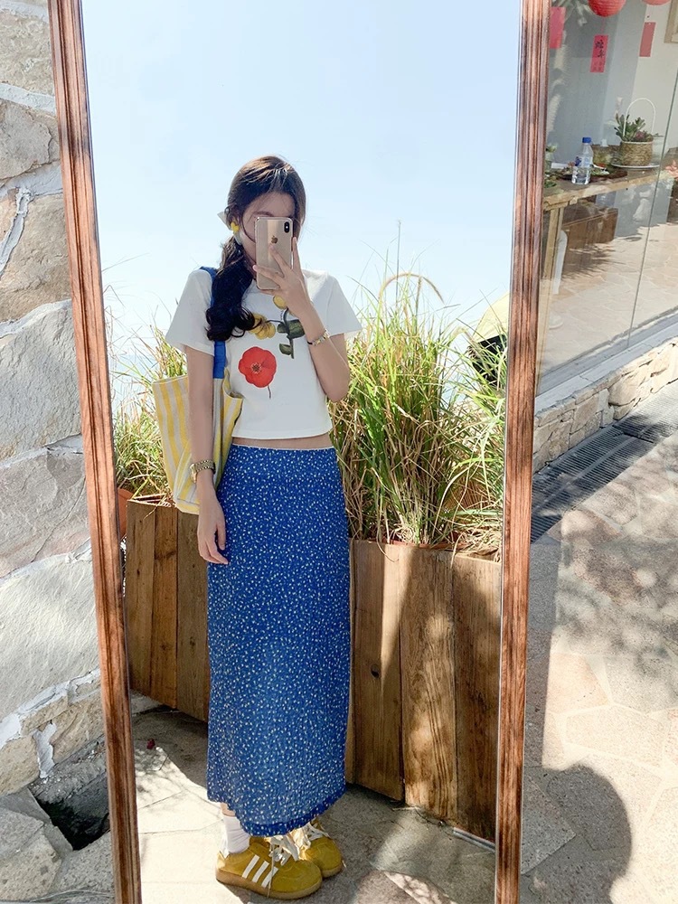 泰兰德少女蓝色碎花雪纺直筒半身裙中裙女夏季高腰油画鱼尾裙