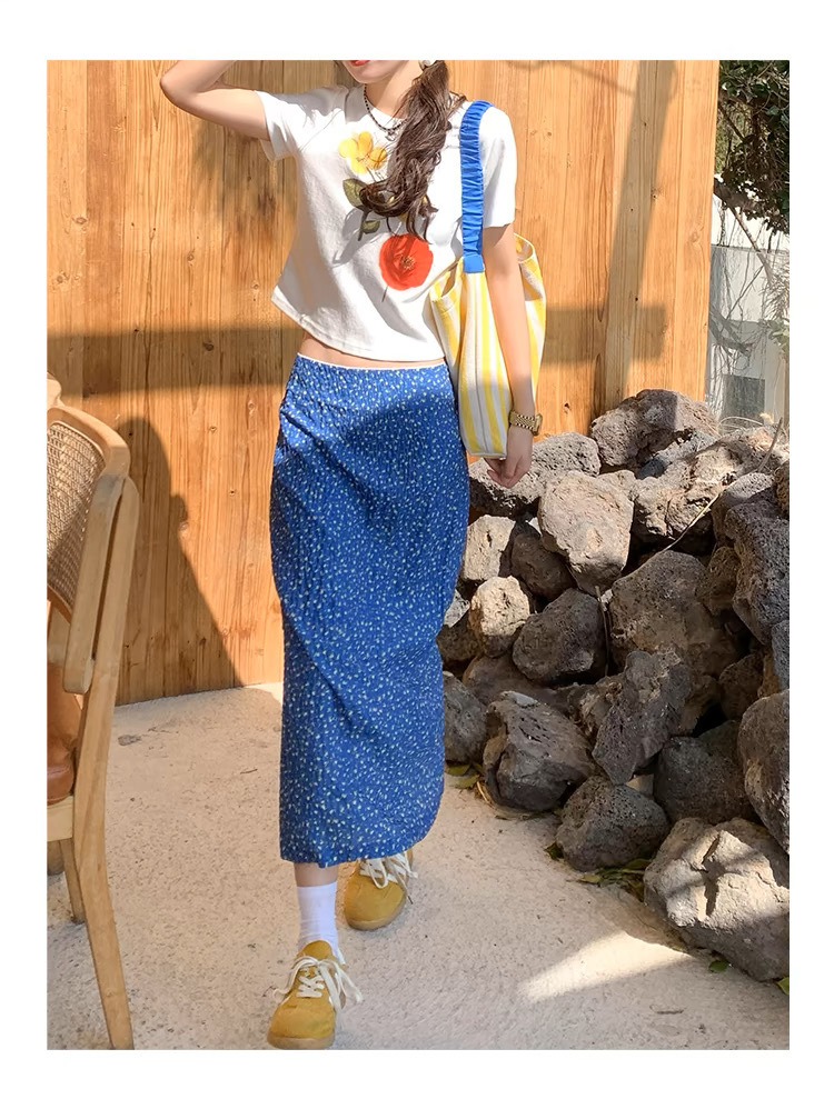 ブルー花柄スカート女性の夏の気質スカートバックスリットヒップカバーロングスカート 2025 新しいスタイル