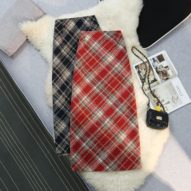 新年の赤い格子の毛の半身のスカートの女性の春と秋の高腰は尻のa字の長いスカートの冬の半分のスカートの小さい体を包みます