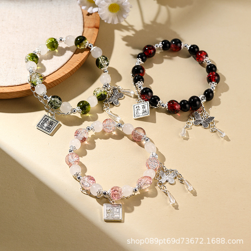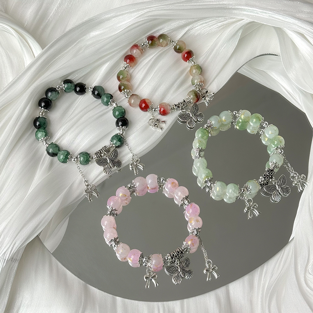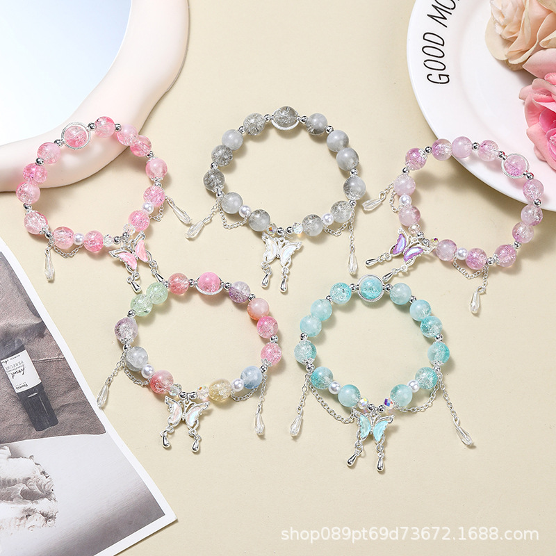 彩色奶盖爆花琉璃手串女蝴蝶流苏琉璃水晶手链小清新文创饰品批发