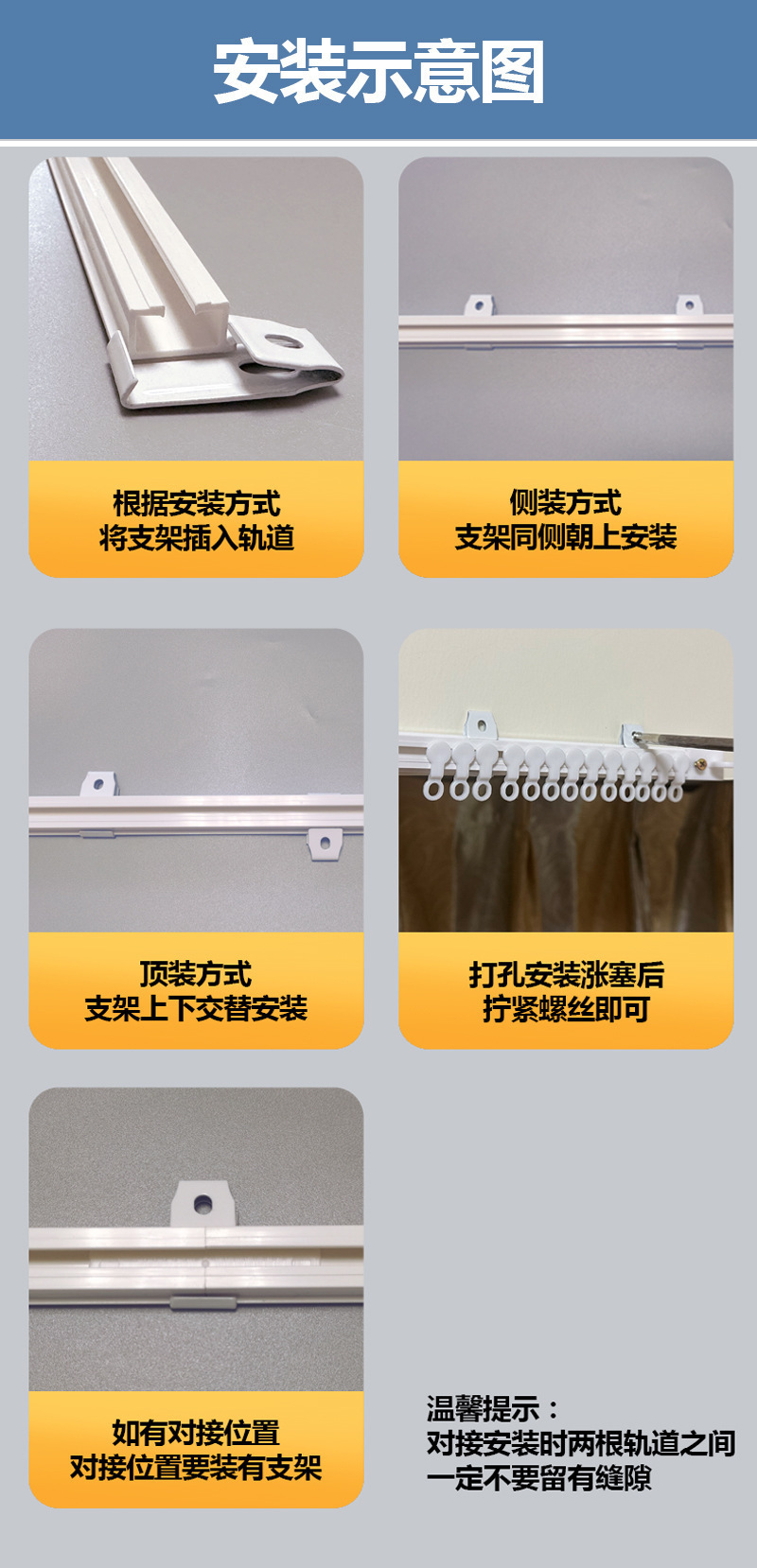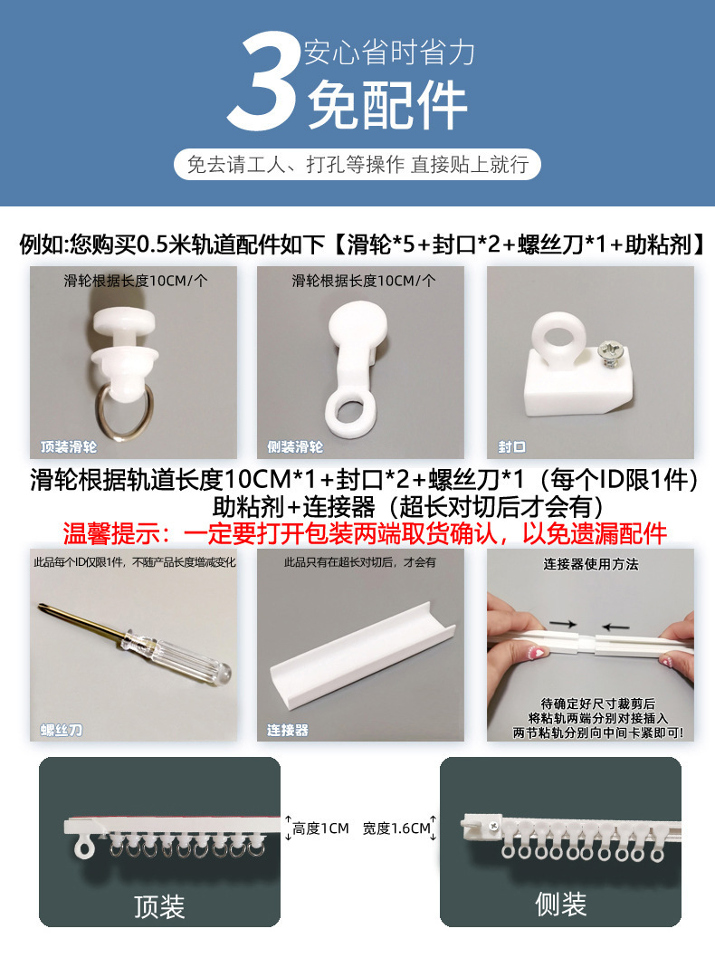 窗帘轨道免打孔滑轨侧装自粘静音导轨配件杆粘轨滑道粘贴滑轮安装