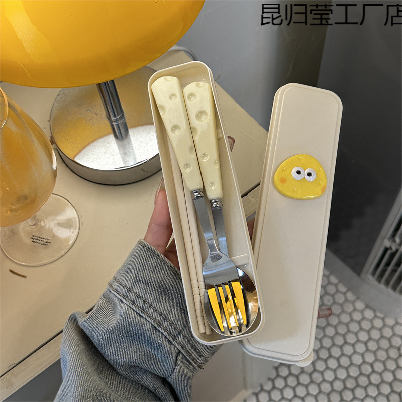 可爱いチーズスタンプフォーク箸三点セット学童携帯食器収纳ケースセット