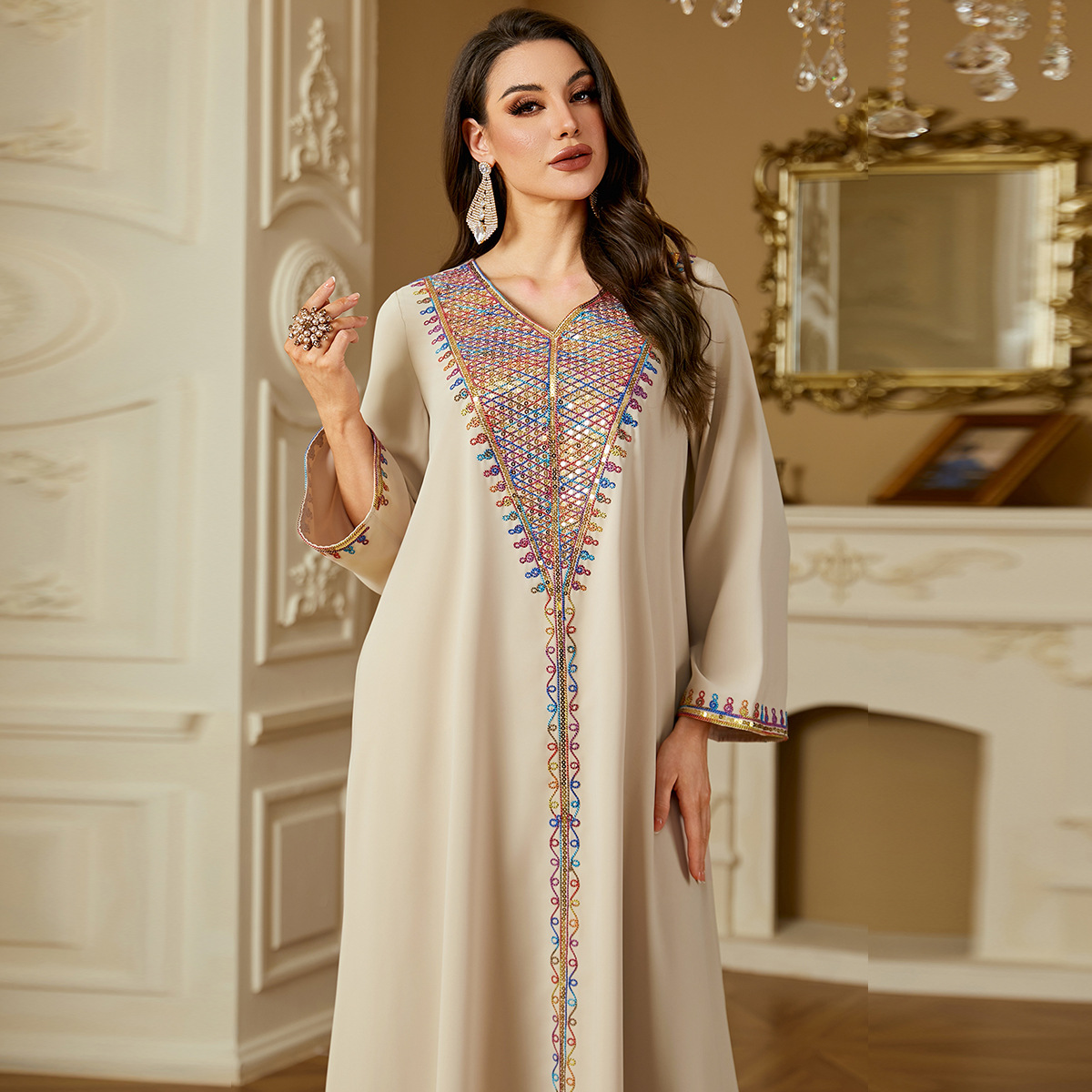 4366中东跨境卡夫坦连衣裙亮片刺绣装饰袖子女士端庄长款Jalabiya