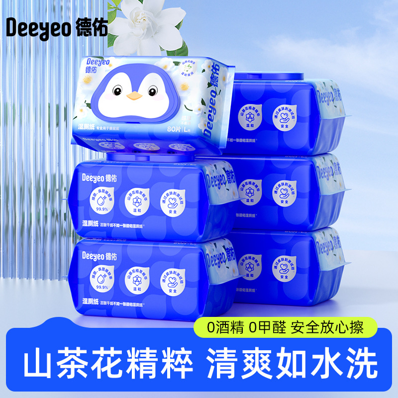 徳佑湿トイレットペーパーツバキの花80は6包を抽出してトイレのウェットティッシュを流すことができます。