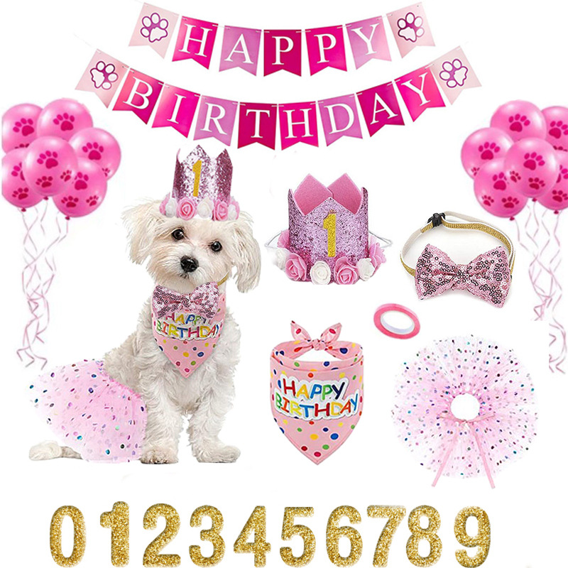 犬の誕生日用メッシュスカートセット ペットの誕生日帽子 ピンクの水玉スカート 水玉三角スカーフ パーティー衣装