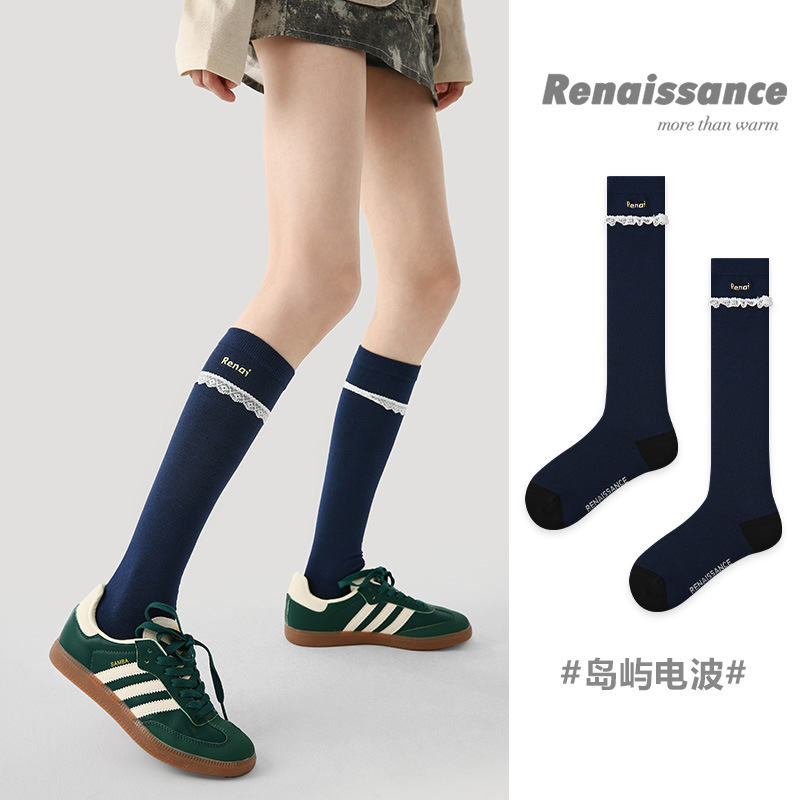 Renaissance原创女袜秋冬新款藏蓝字母蕾丝公主袜显瘦小腿袜子女