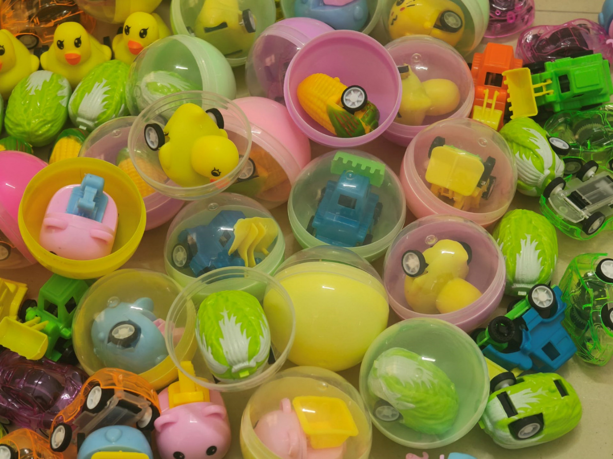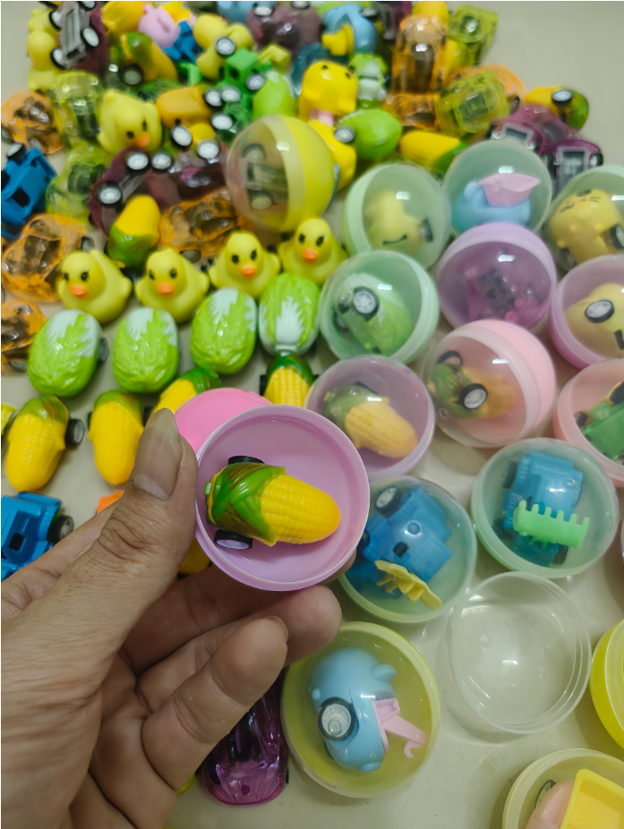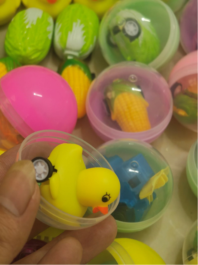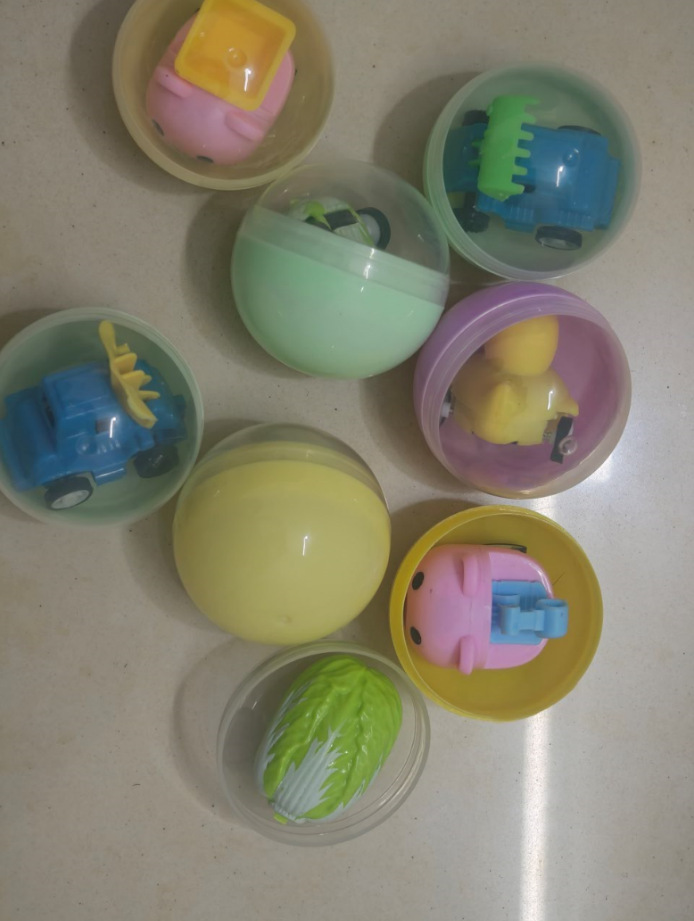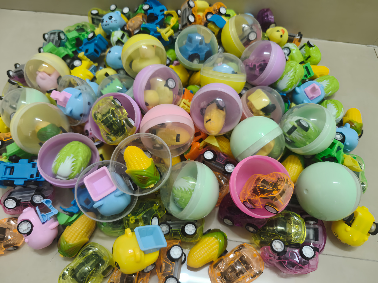 1元で購入できる50mmの小型おもちゃ、ガチャガチャ、工事車両、フルーツカート、ガチャマシン、慣性回力車、知育玩具