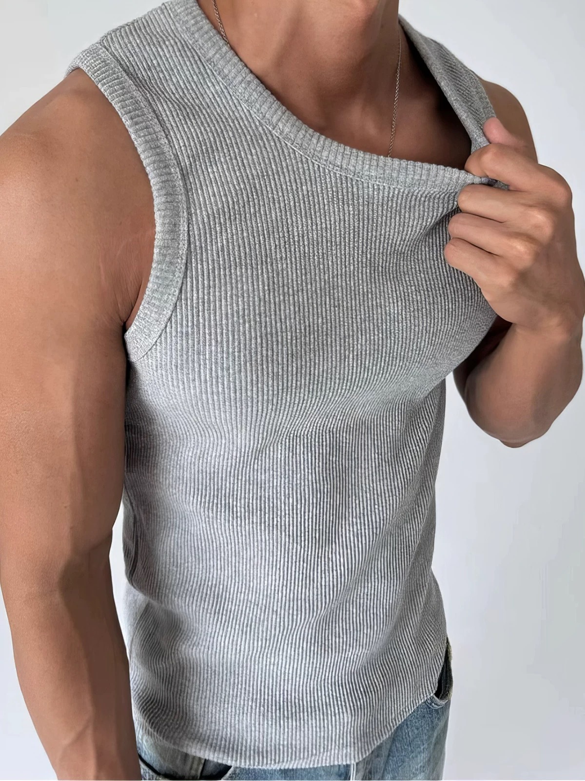 アメリカンニットグレーフィットネススウェットベストメンズスレッドストレッチスリムフィットノースリーブTシャツスポーツトレーニングボトリングシャツ