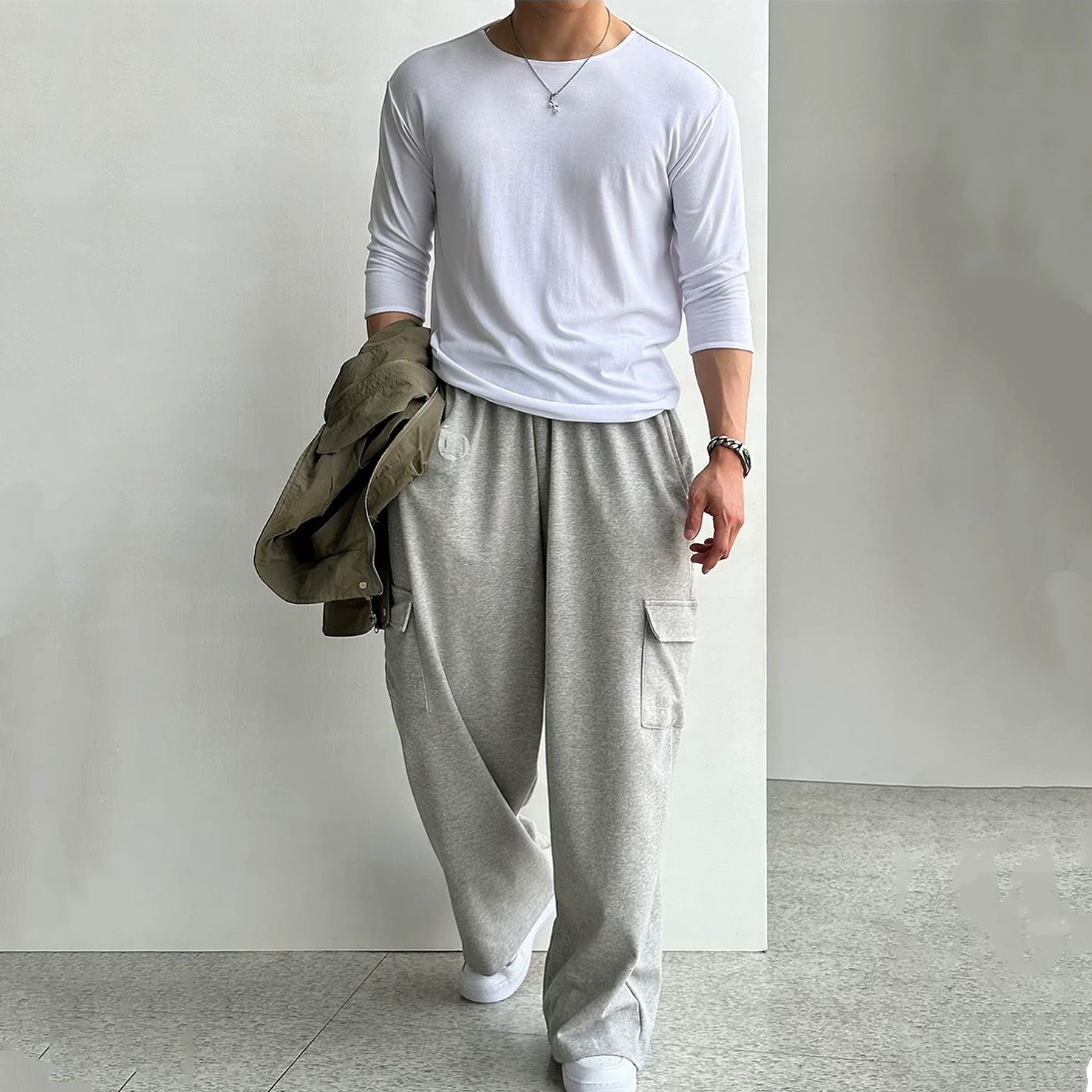 アメリカの薄い灰色の運動の広い足の衛のズボンの男性の韓風のゆったりしているレジャーの仕事のズボンの大きいポケットのまっすぐな筒のズボンの春秋