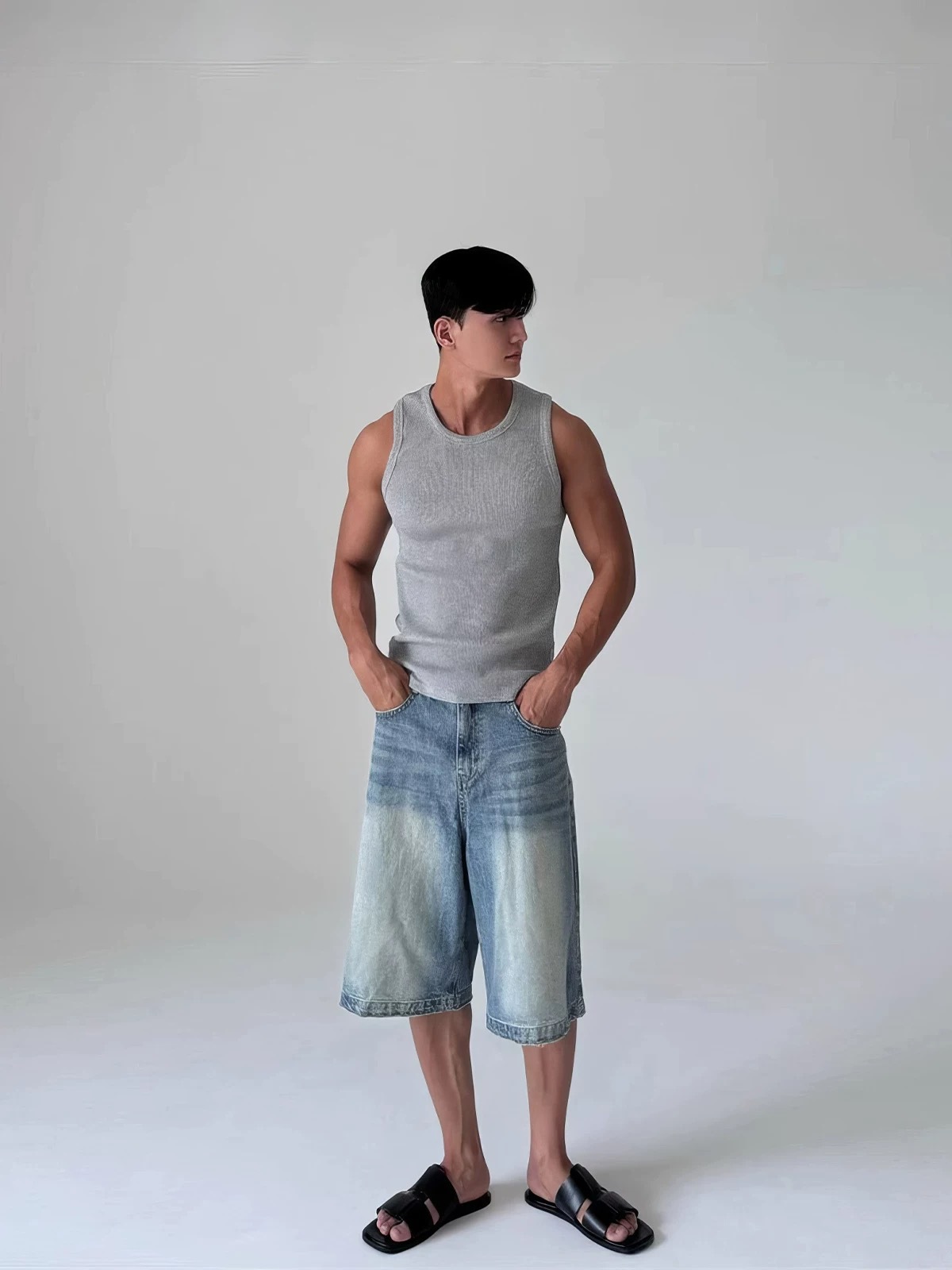 アメリカンスタイルのU字型ラージネックベストメンズプリーツテクスチャルーズノースリーブTシャツワッフルジャカードニットベストトレンディ