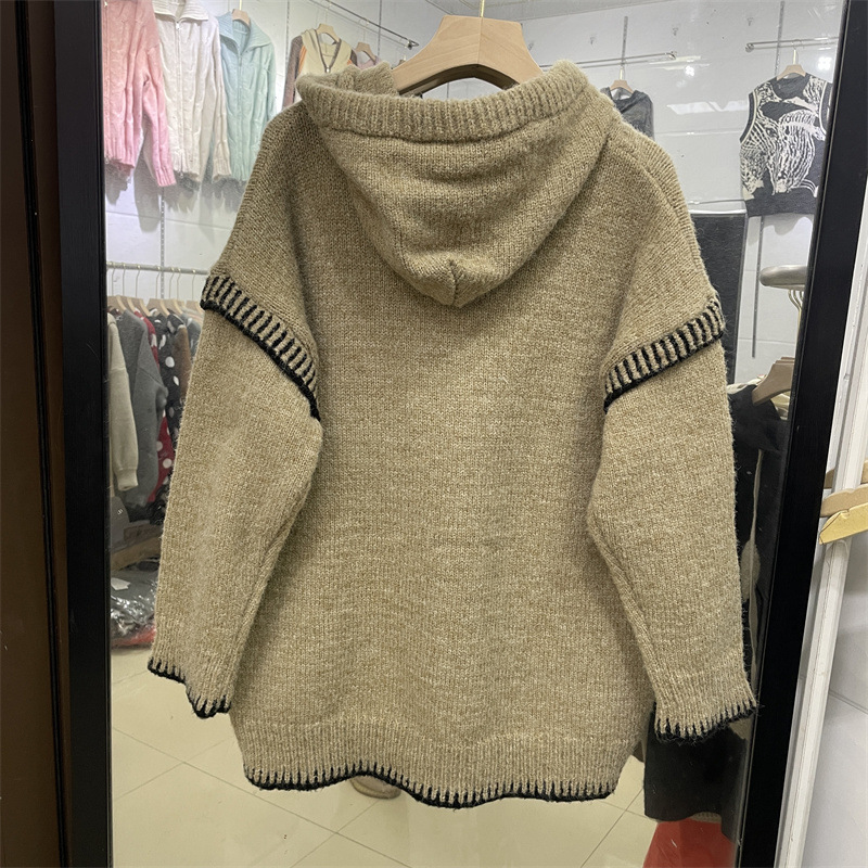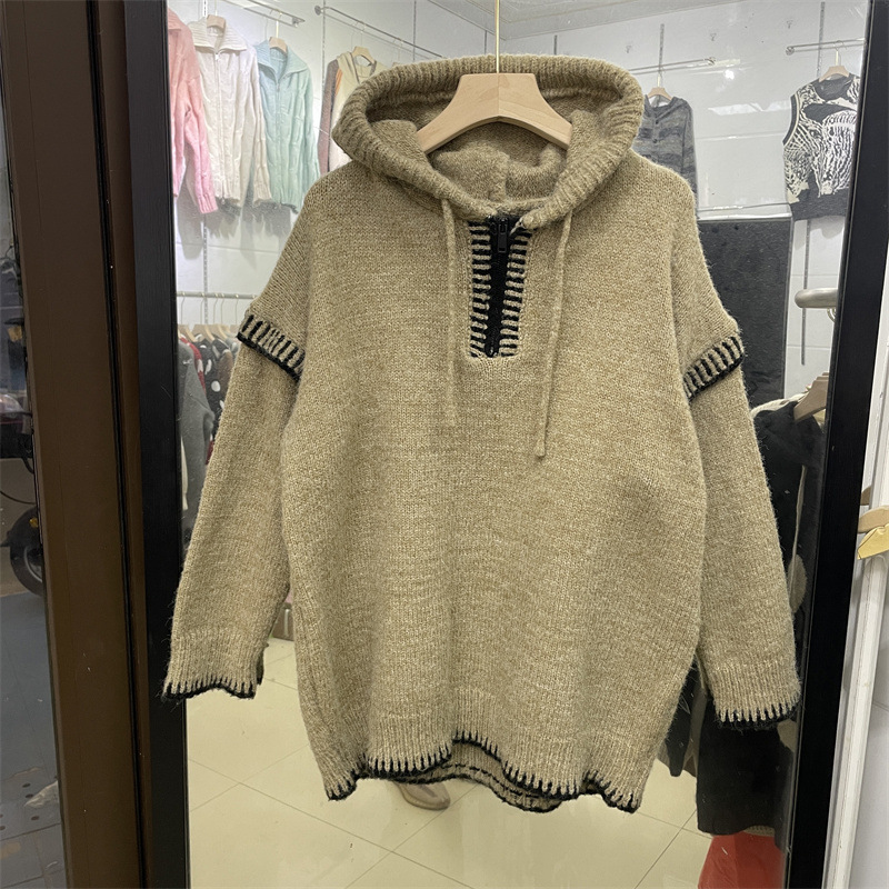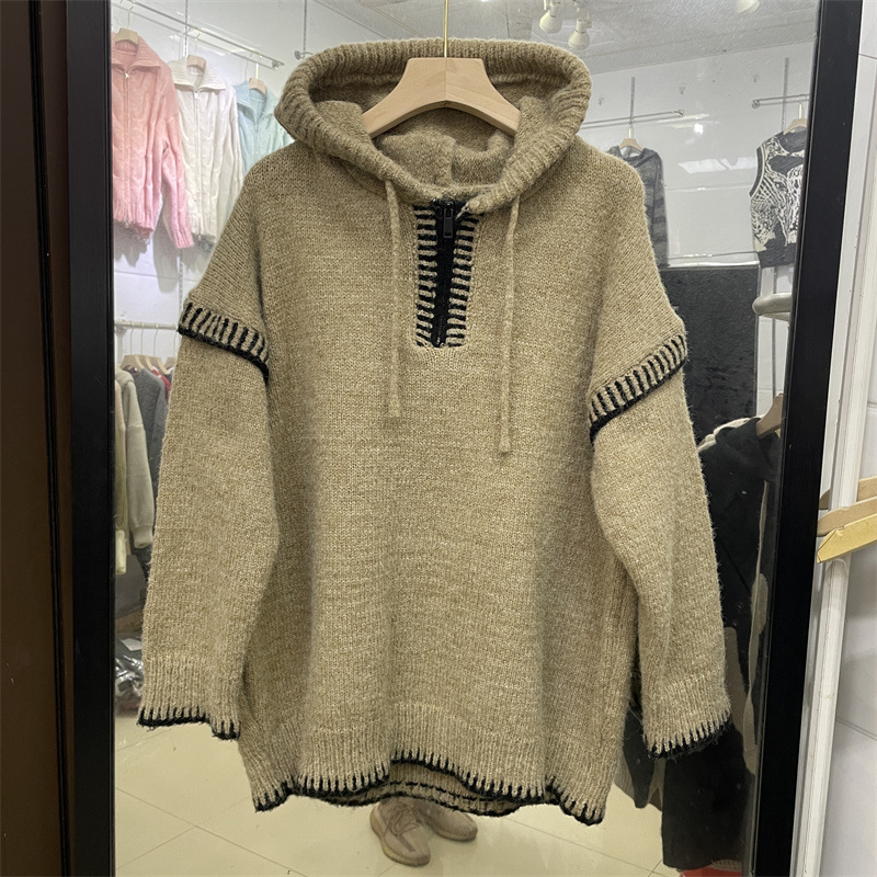 ヨーロッパステーション秋と冬の新しいハーフジップフード付きセーター女性のルーズコントラストカラーニッチデザインニットセータートップトレンディ