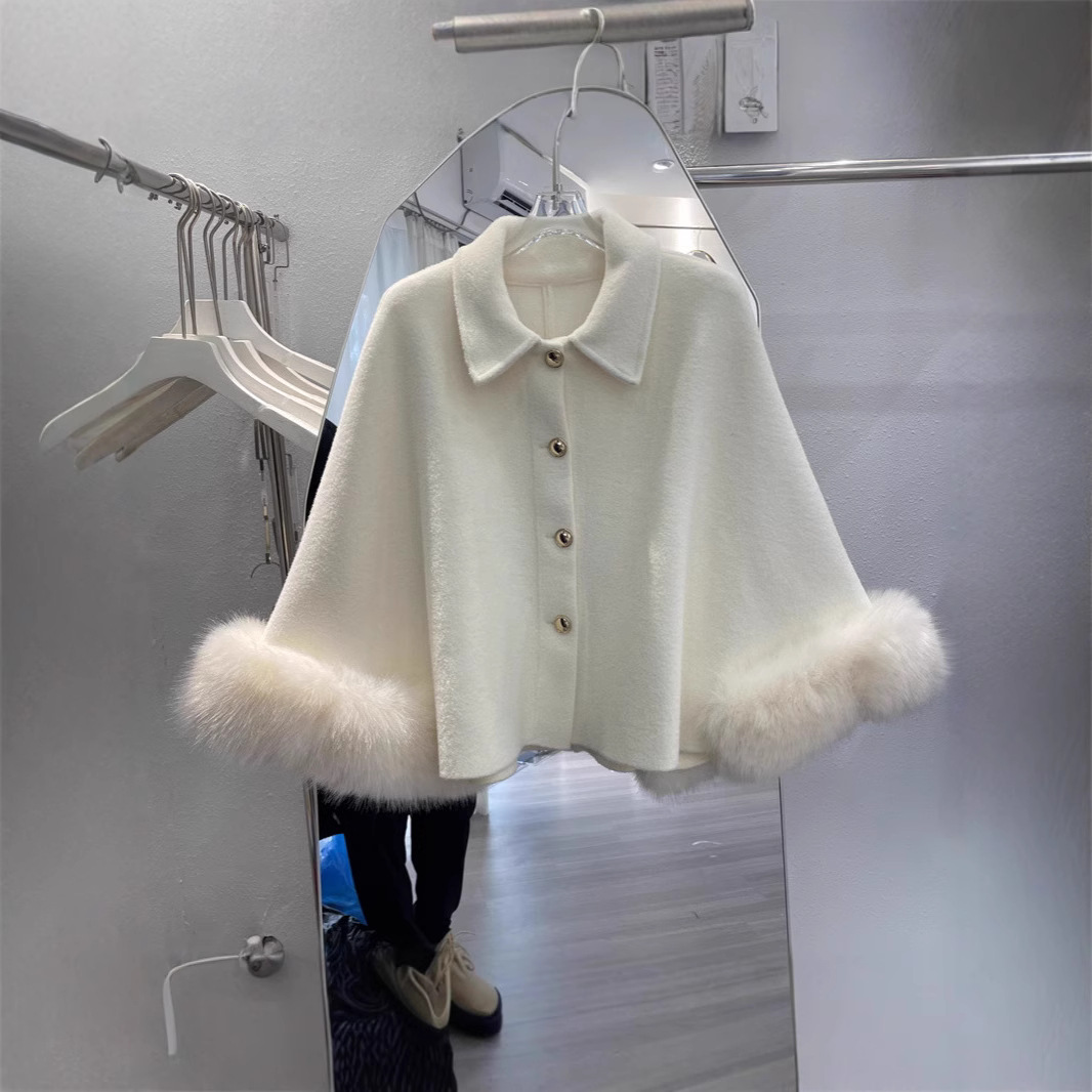 ヨーロッパ風初秋冬コート レディース フェイクウールコート パールベルベットケープ フェイクフォックスファー袖 ベルベットステッチ