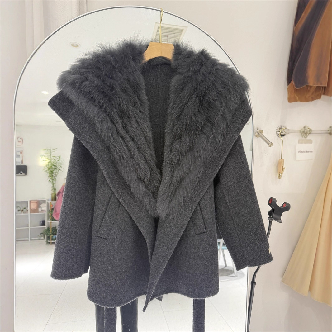 2025秋冬新款海军领廓形双面羊毛大衣真狐狸毛皮草外套女中长款潮