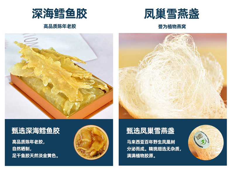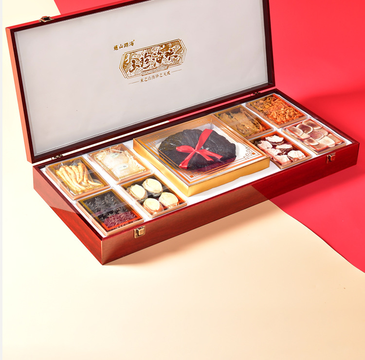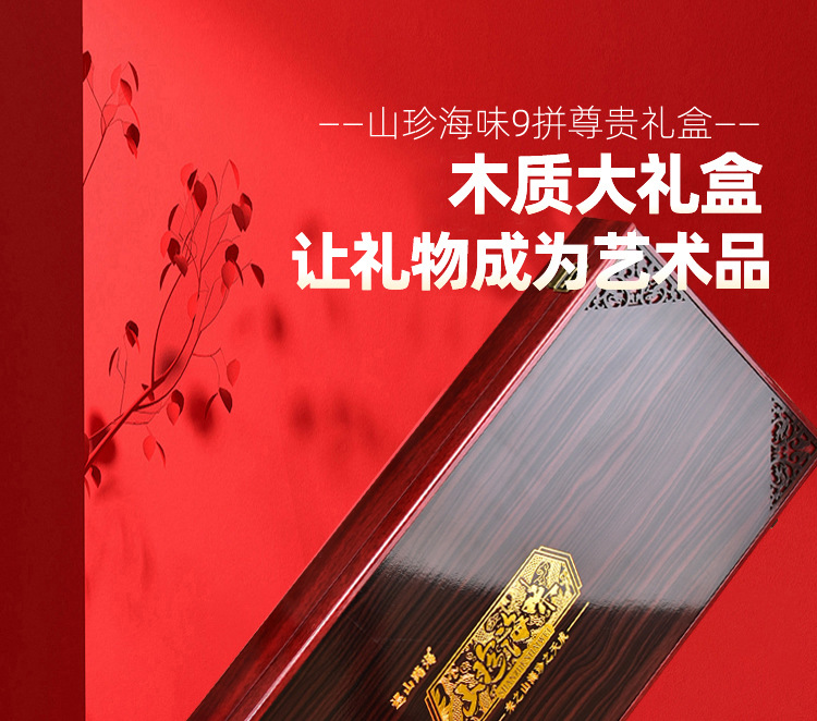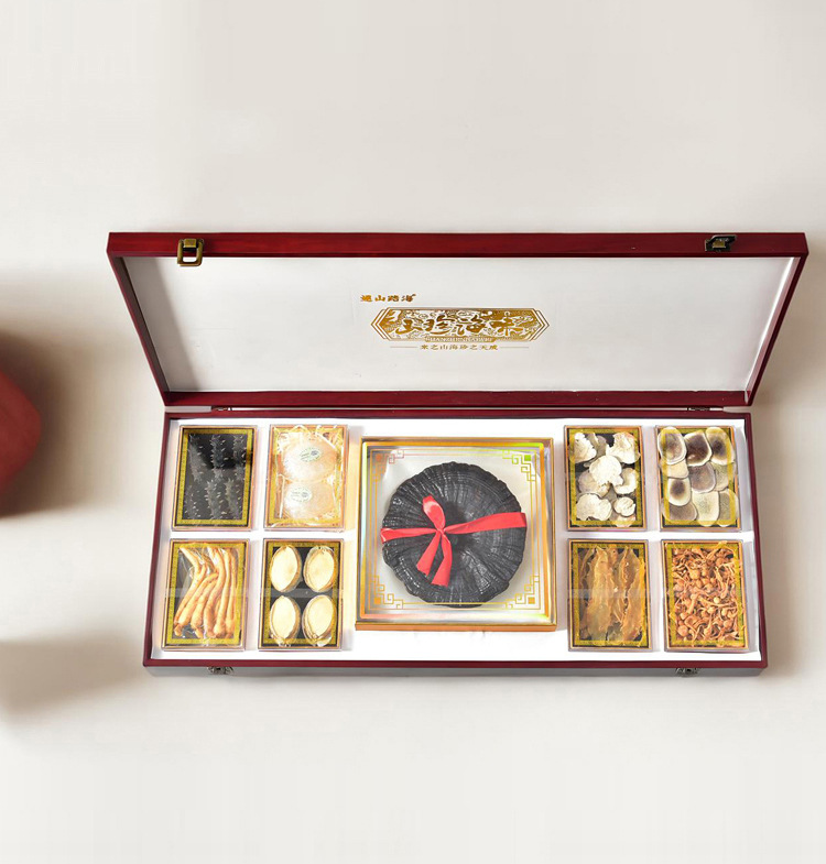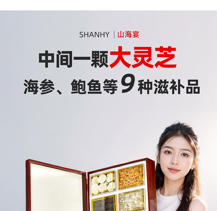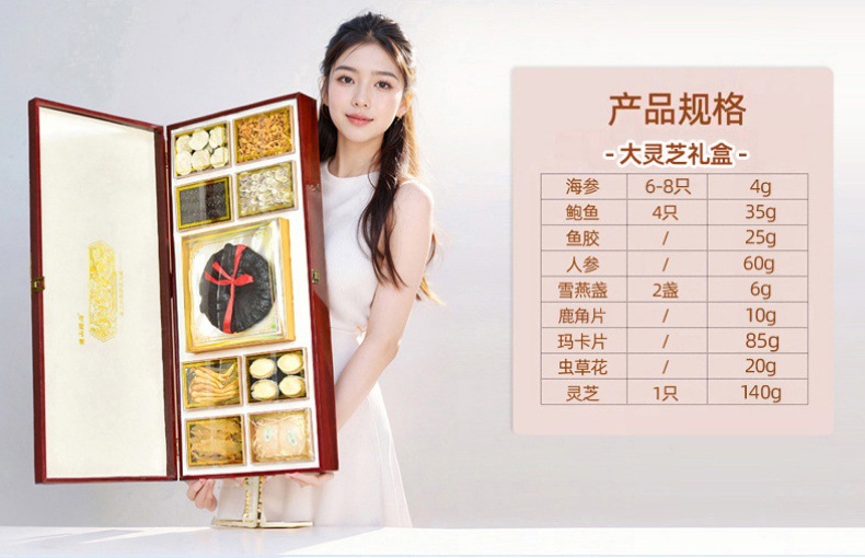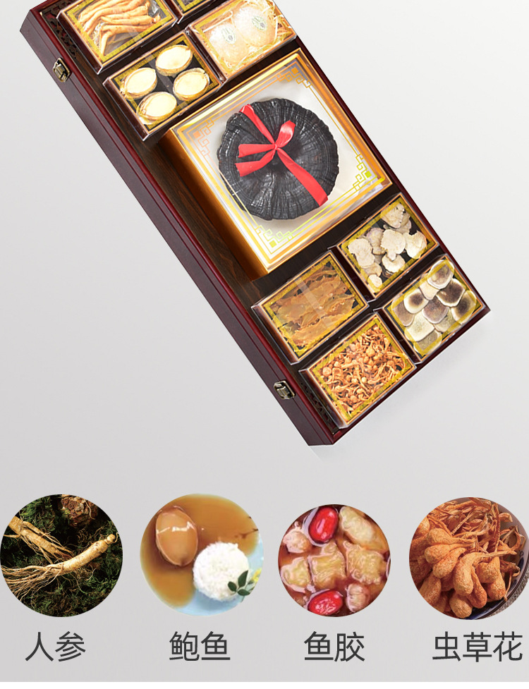礼盒内滋补食材含有:大灵芝1颗、海参、鲍鱼、鱼胶、人参、雪燕盏、鹿角片、虫草花、玛卡片。足足9种滋补品