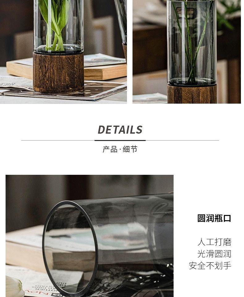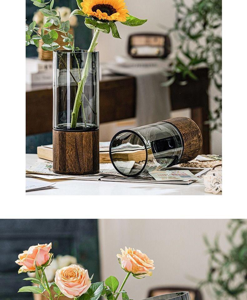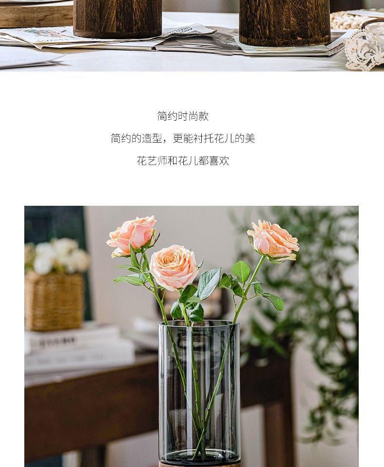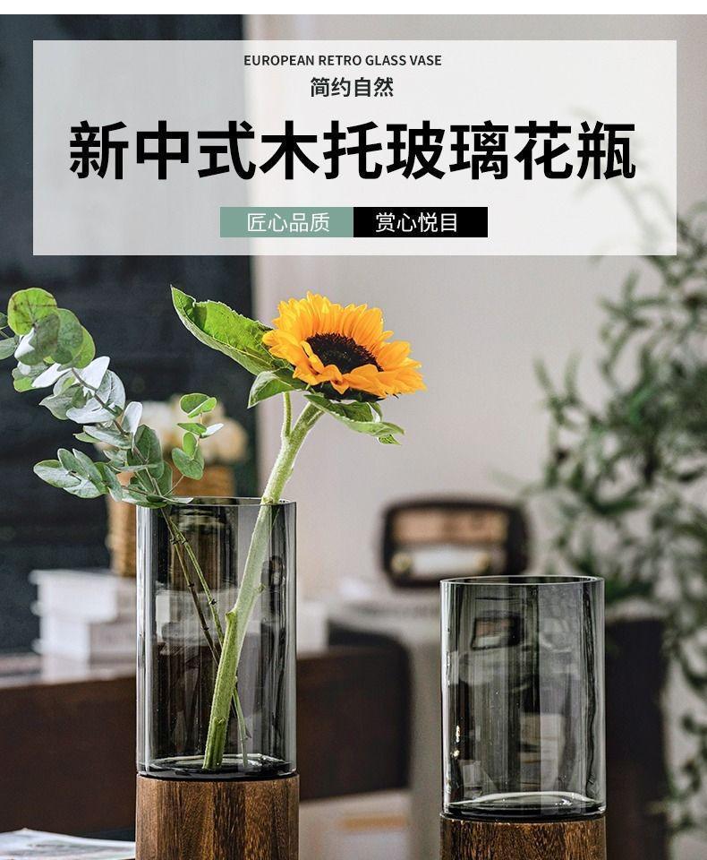 ガラス花瓶中国風木製トレイストレート花瓶リビングルームフラワーアレンジメント装飾ライト高級ハイエンドガラス水耕栽培