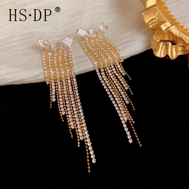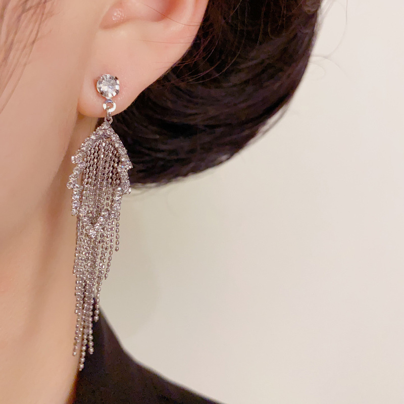 跨境个性时尚夸张锆石一字长款流苏耳坠轻奢精致百搭超闪耳环批发