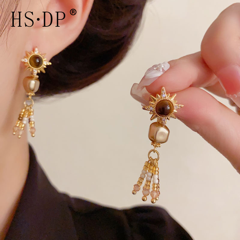 法式简约太阳花虎眼石咖色珍珠流苏耳坠个性轻奢时尚复古耳环批发