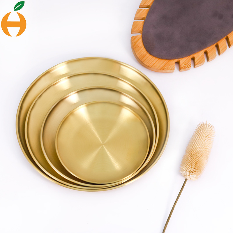 工場直販韓国ステンレスバーベキュープレートゴールドラウンドプレート洋食トレイ野菜プレートフルーツケーキデザートプレートボーン
