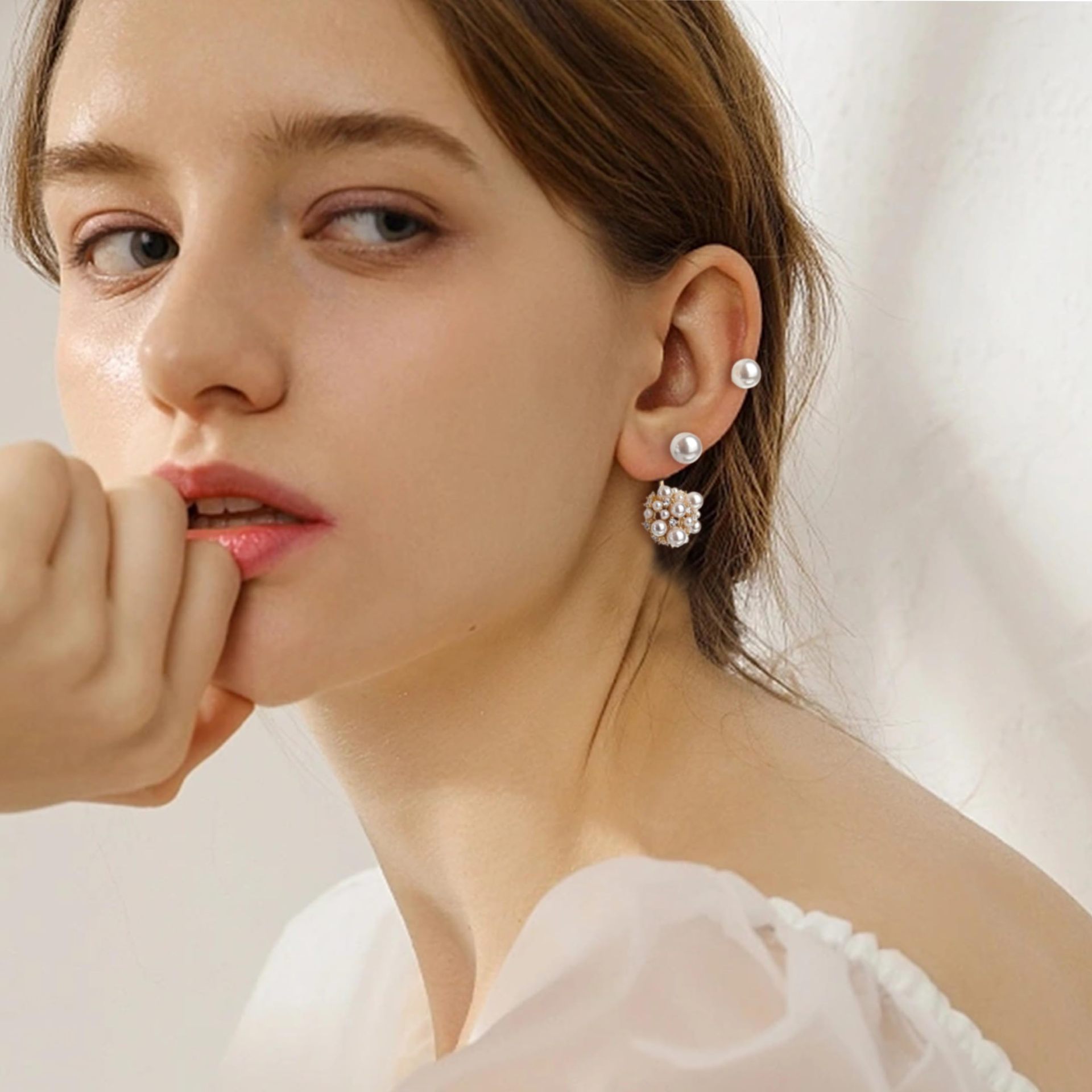 個性的で高級感のある、後ろに留めるタイプのパールイヤリング。女性向け、おしゃれで万能、シンプルなイヤーアクセサリー。
