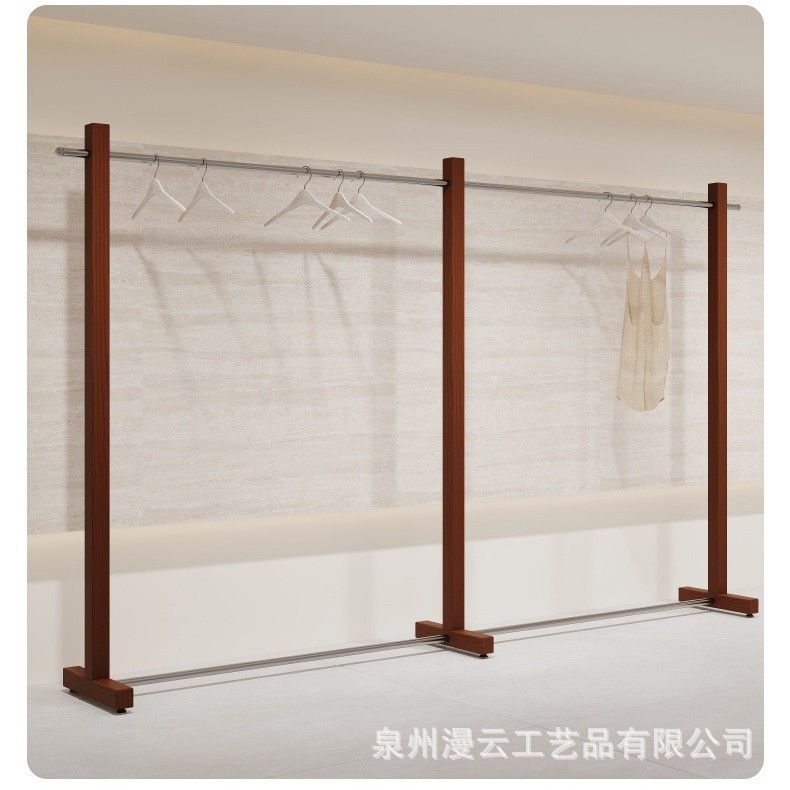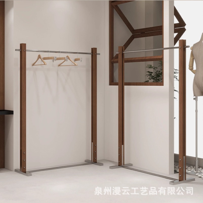 服装店展示架落地式不锈钢胡桃色陈列架女装货架中古风挂衣陈列架