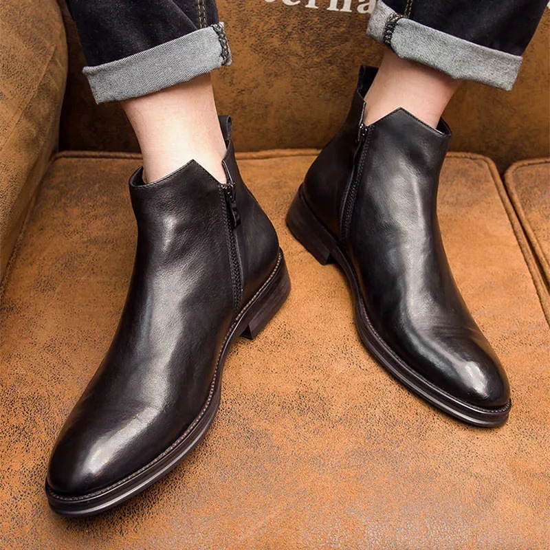 方头切尔西靴男真皮马丁靴侧拉链英伦风休闲中帮皮鞋厚底短靴子男