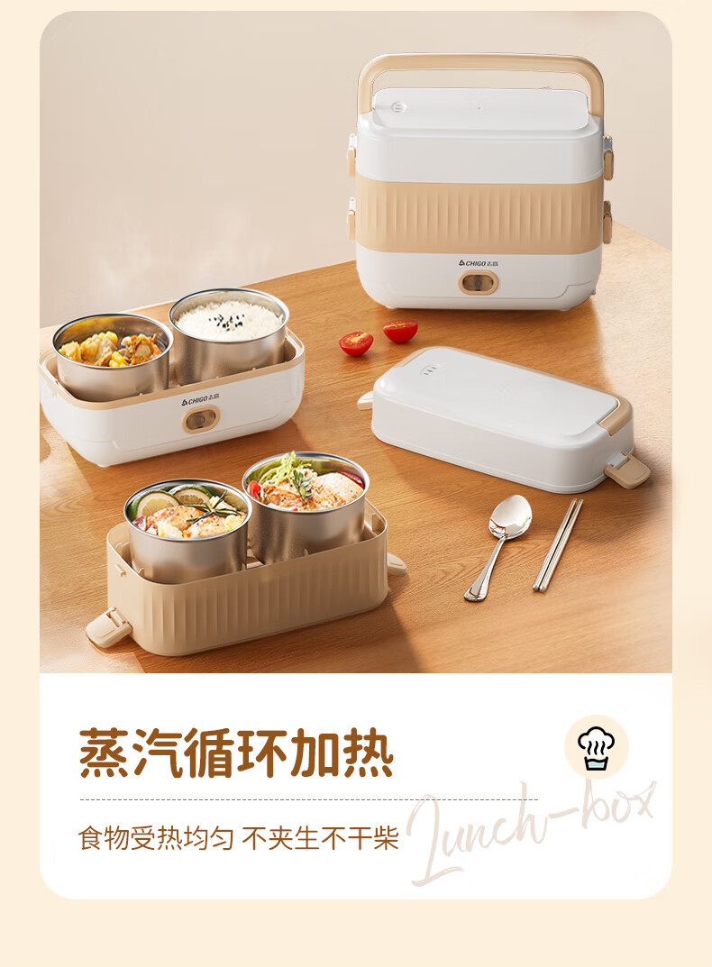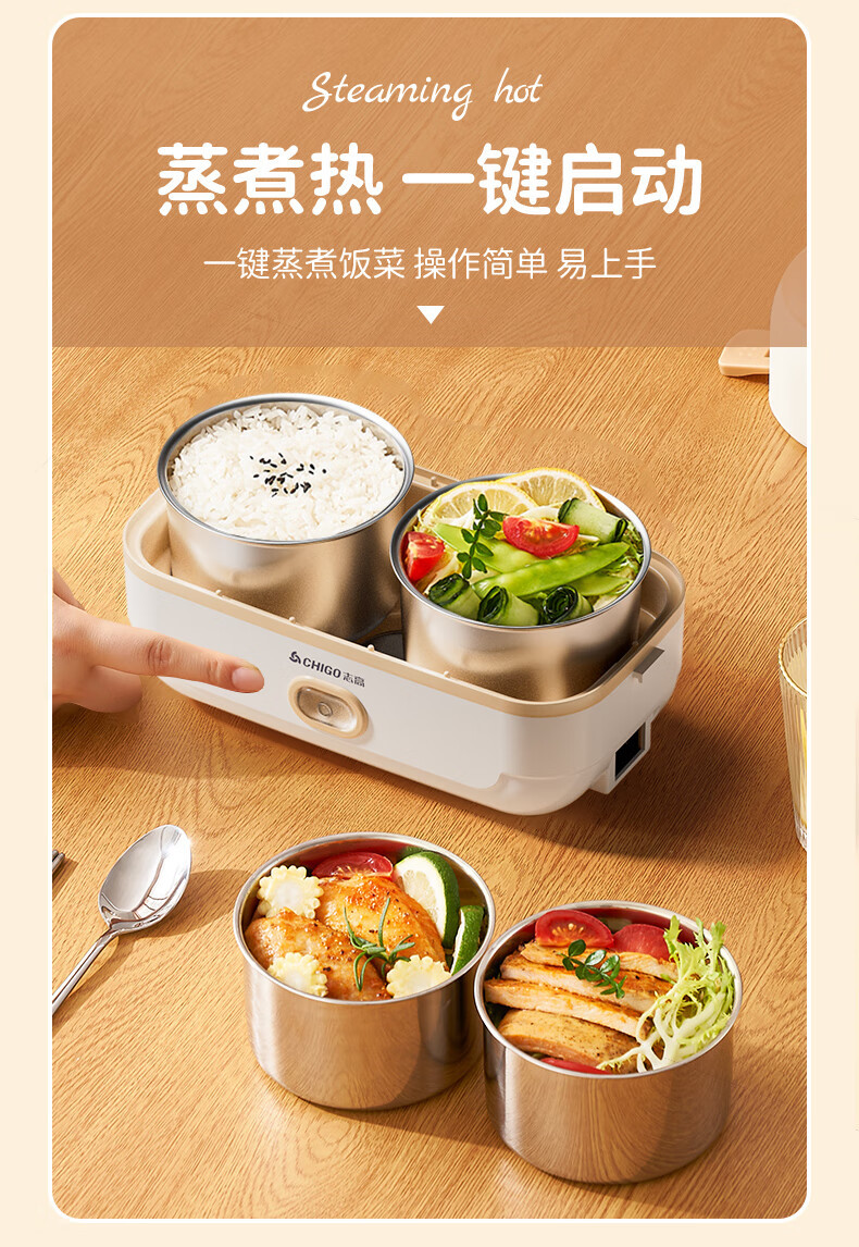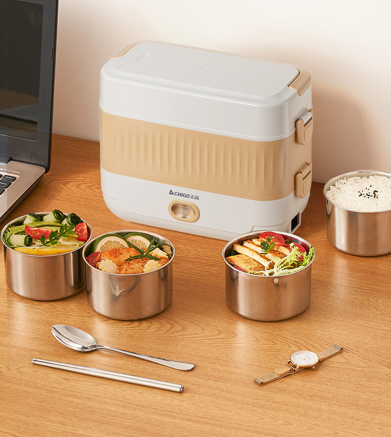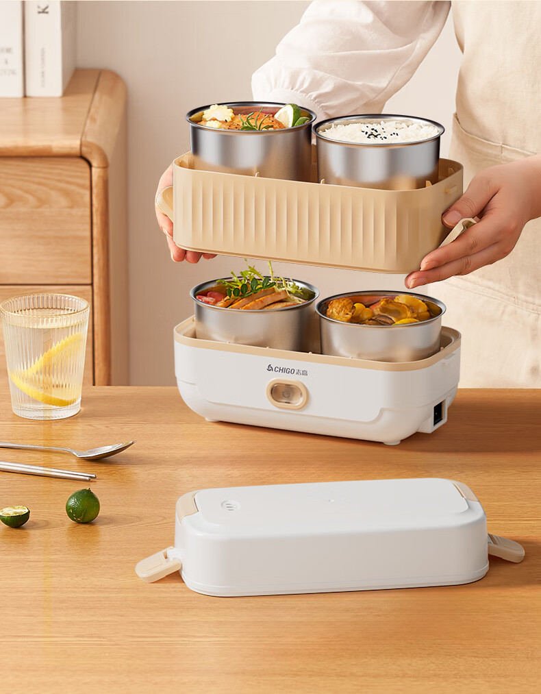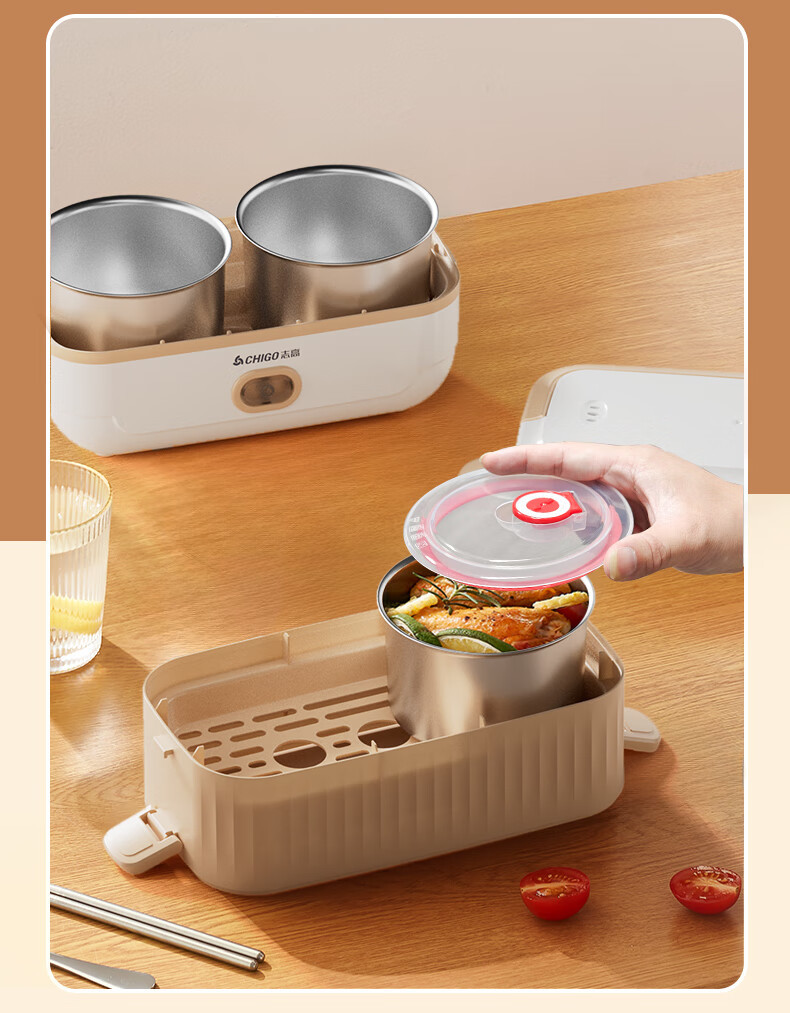 Chigo オフィスステンレス鋼電気弁当箱断熱加熱二層ミニポータブルハンドル電気弁当箱