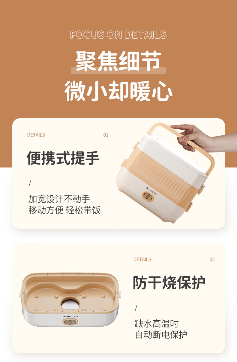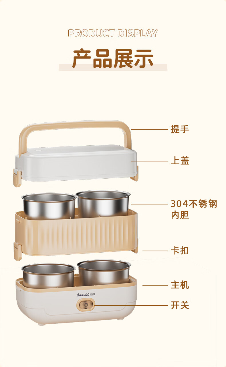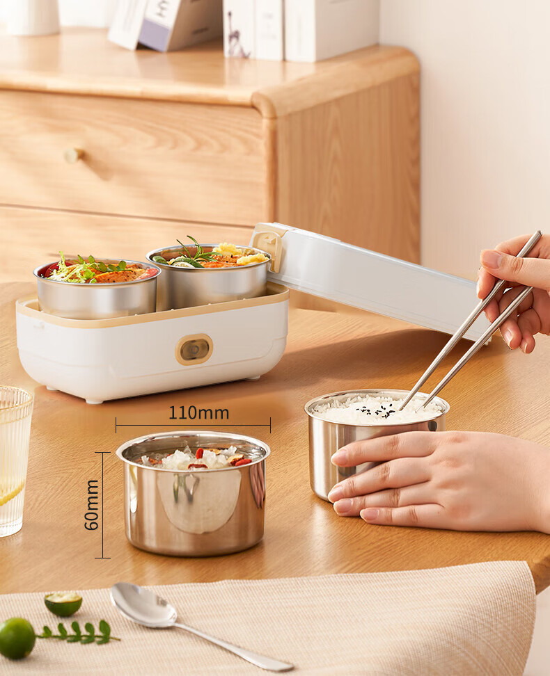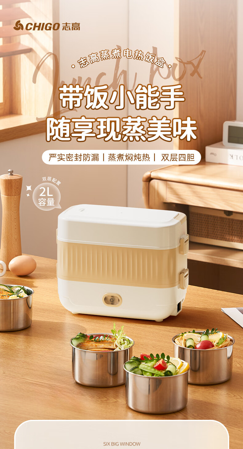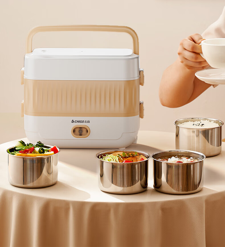 Chigo オフィスステンレス鋼電気弁当箱断熱加熱二層ミニポータブルハンドル電気弁当箱