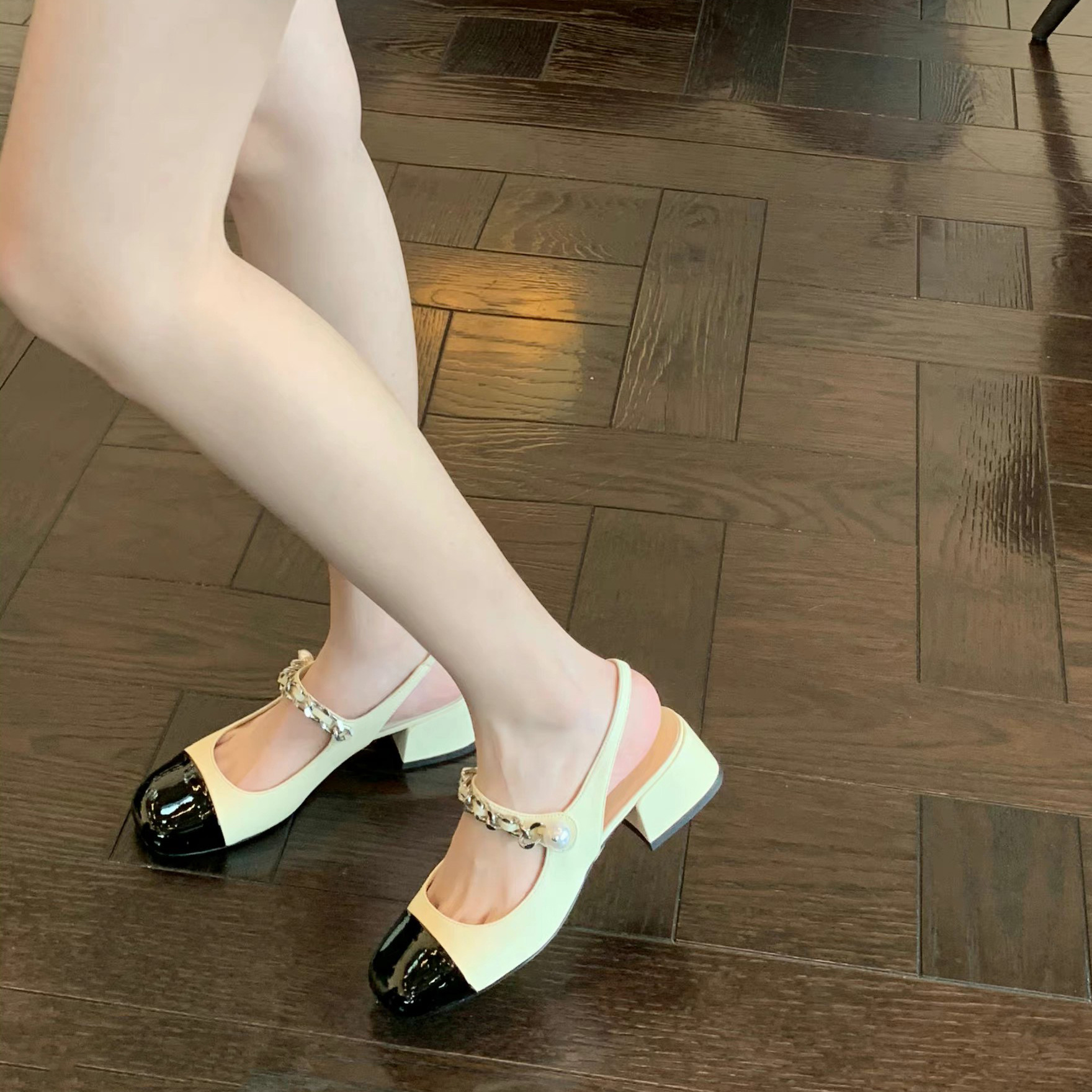 牛革バージョン~フェアリースタイルパール本革ハイヒールサンダルレディース太ヒールワンライン包頭フレンチスモールサンダルサンダル