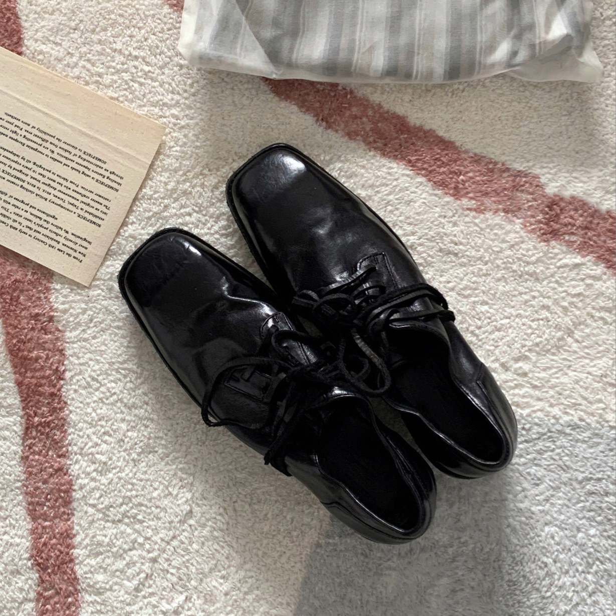 レトロ牛革黒の小さな革靴女性の厚いヒールスクエアトゥ本革靴英国スタイルミッドヒール靴 JK 革靴小さなヒール靴
